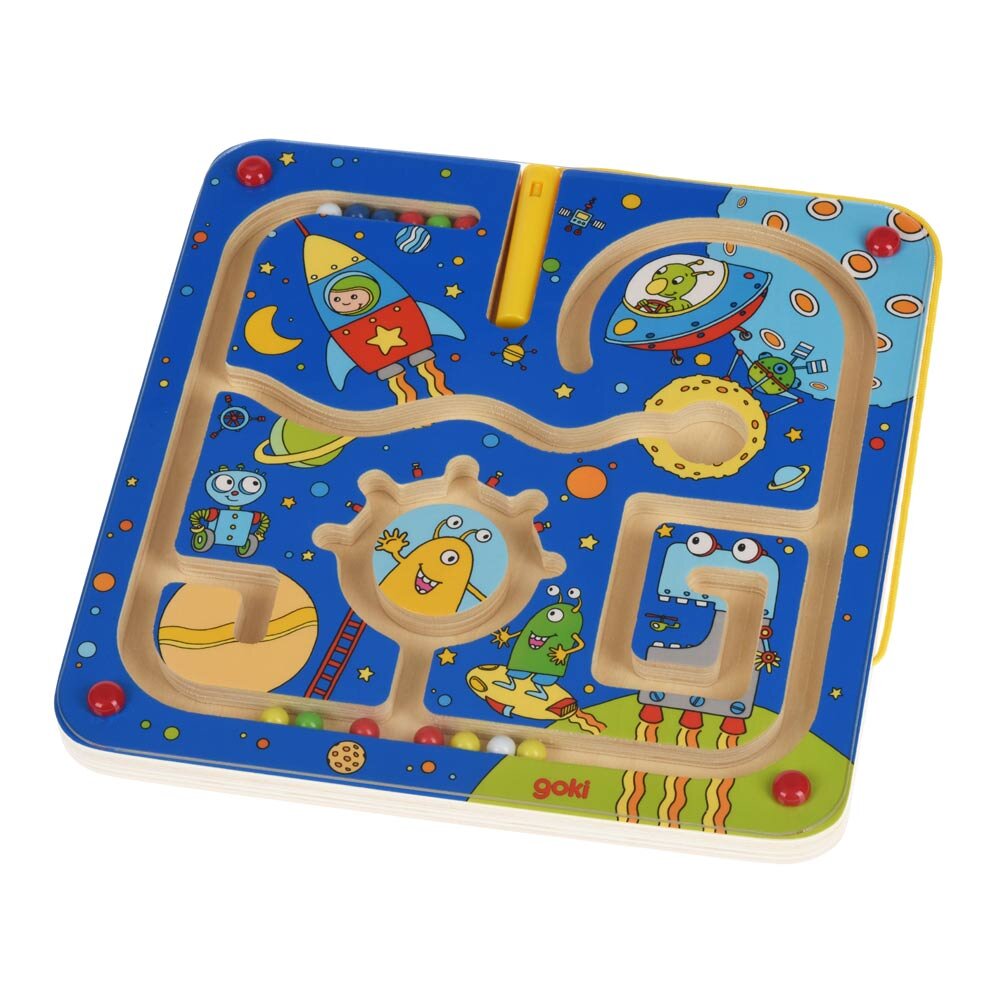 Оригінальний світ космосу втілений у грі Goki Магнітний лабіринт Космос. Однаково весело буде і хлопчикам, і дівчаткам. Щоб досягти цілі, потрібно провести різнокольорові кульки у прорізах лабіринту за допомогою ручки з магнітним наконечником.