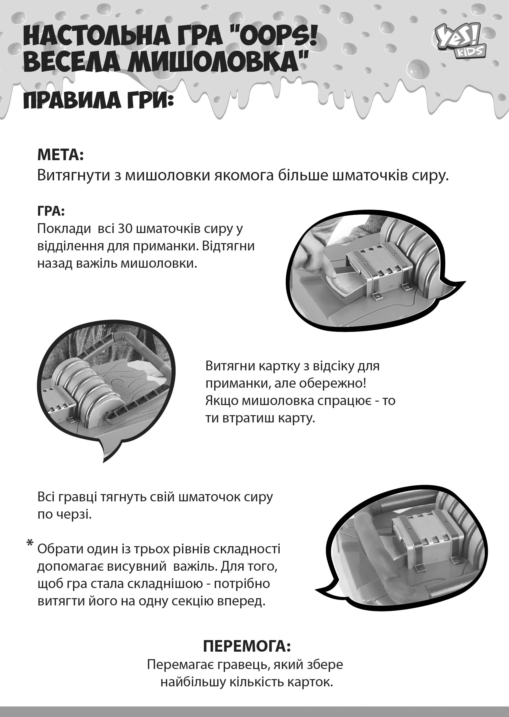 Набір містить пластикову мишоловку, тридцять (30) карток із зображенням сиру, а також інструкцію. Для гри дитині необхідно лише покласти паперові картки шматочок сиру в мишоловку і вибрати рівень складності. Після цього треба буде відтягнути назад важіль і спробувати витягнути сир, не попавши у пастку.