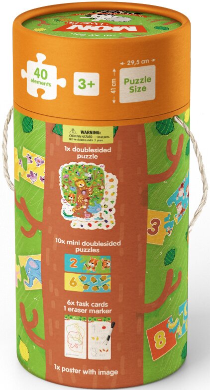 У комплекті: 1 двосторонній пазл, 1 двосторонній постер, 10 пазлів міні, 1 стиральний маркер, 6 карток із завданнями.