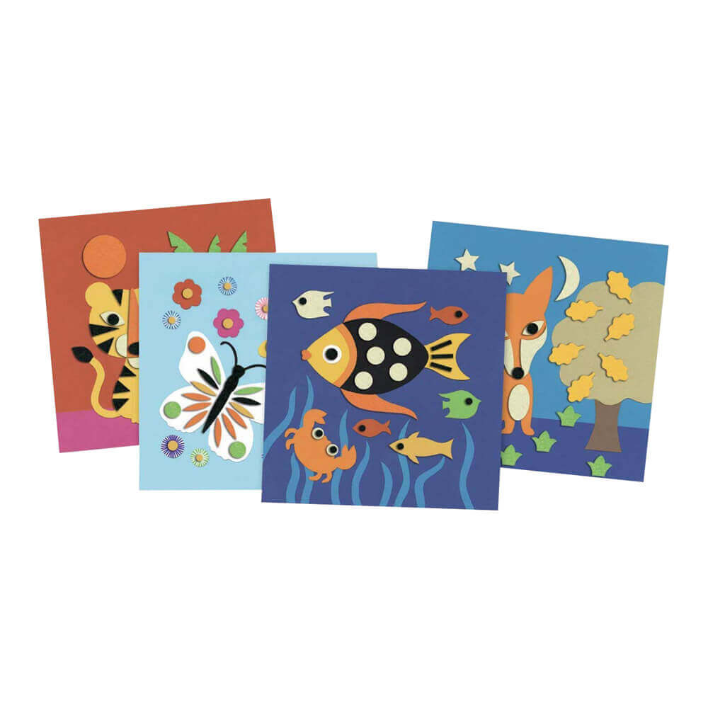 З художнім комплектом французського бренда DJECO Аплікація Солодка природа ваша дитина весело проведе час. Комплект дасть можливість прикрашати барвистими елементами пейзаж, характерний для місць, де живуть тварини, зображені на картині.