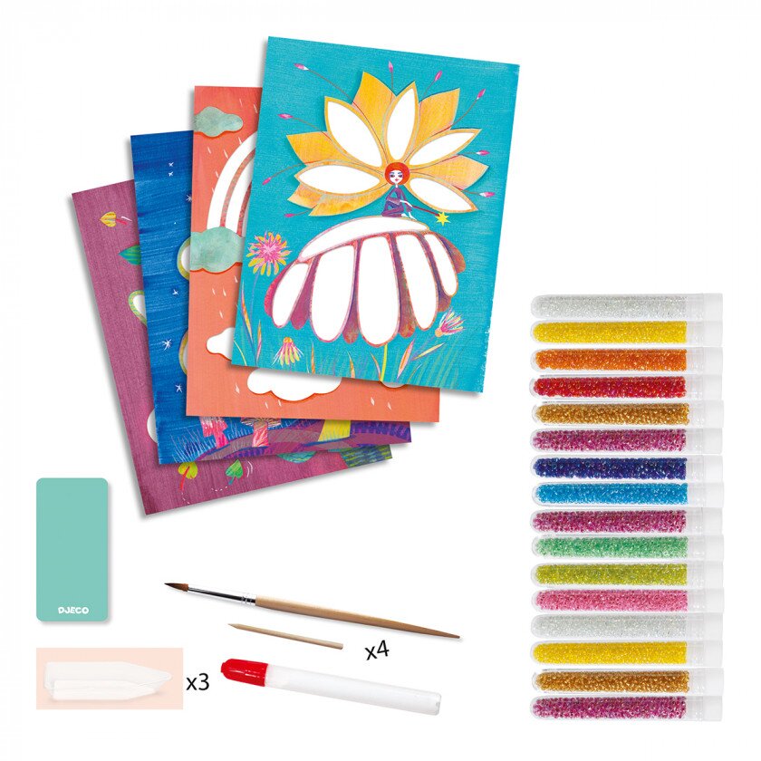 Художній комплект Djeco – це яскравий та барвистий колаж для творчості. В наборі 4 картини на тему фей в комплекті з бісером. Дитина додає клей на ілюстрацію, потім розсипає і розподіляє намистинки. Ілюстрації яскраво світяться і є відмінним декором.