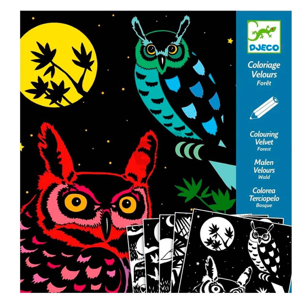 Художній комплект для малювання Ліс французського бренда DJECO розширить уявлення дітей про матеріали і техніки. Комплект має 5 картинок для розмальовки. Папір в наборі оксамитовий. Такий матеріал контролює рухи пензлика, не даючи заходити за краї. Тому всі картинки виходять акуратними і красивими, навіть якщо малює малюк. Цей набір виконаний в лісовій тематиці. На папері підібрані сюжети з тваринами. Тут є картинки з совами, вовками, жабами та іншими жителями лісу. Малюючи, дитина запам'ятовує деталі, в неї розвивається фантазія і колірне сприйняття.