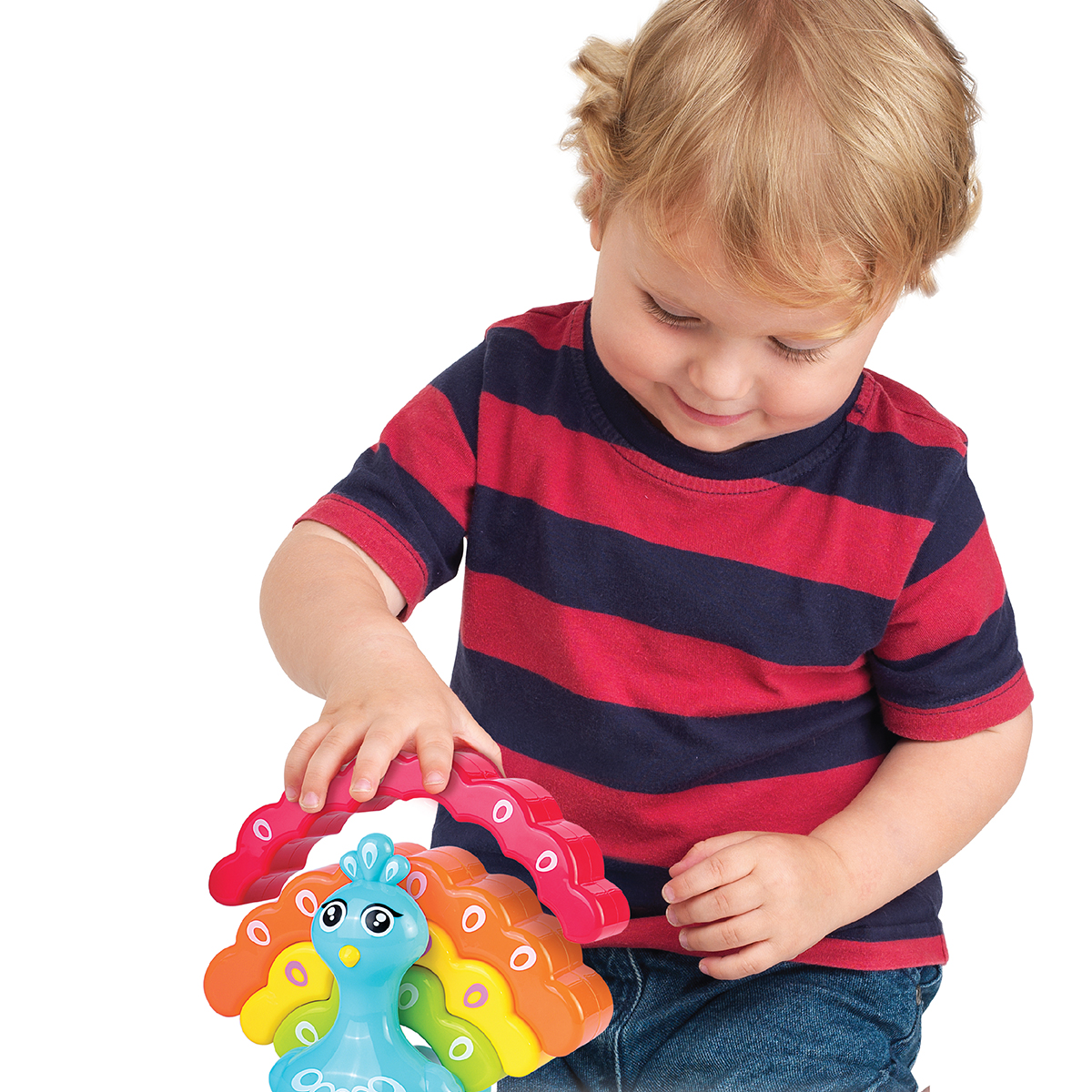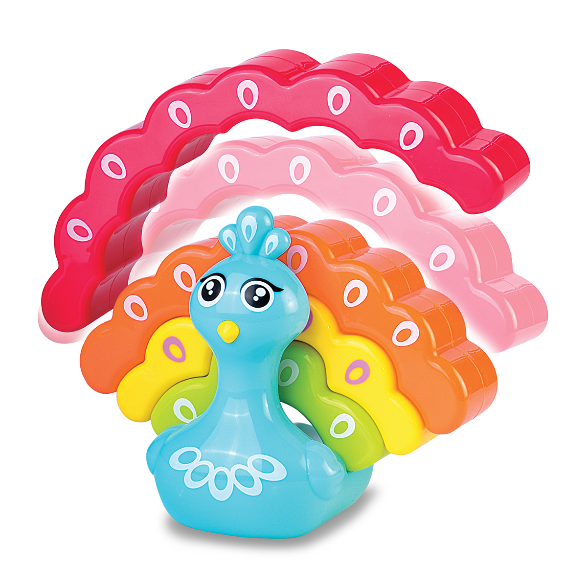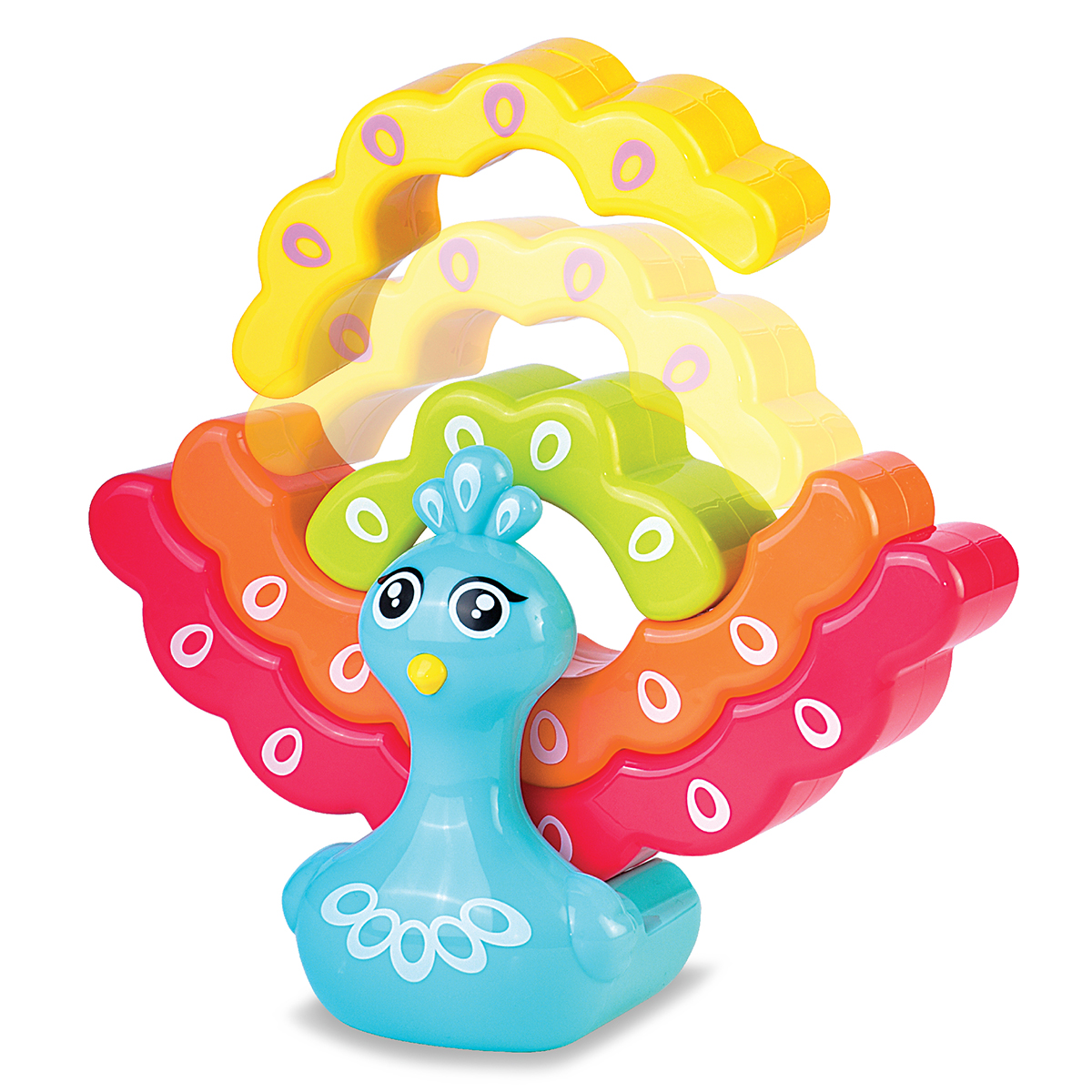 Забавка у вигляді павенятка знайомить дитину не лише з цікавим екзотичним птахом, але й з різними кольорами і формами.