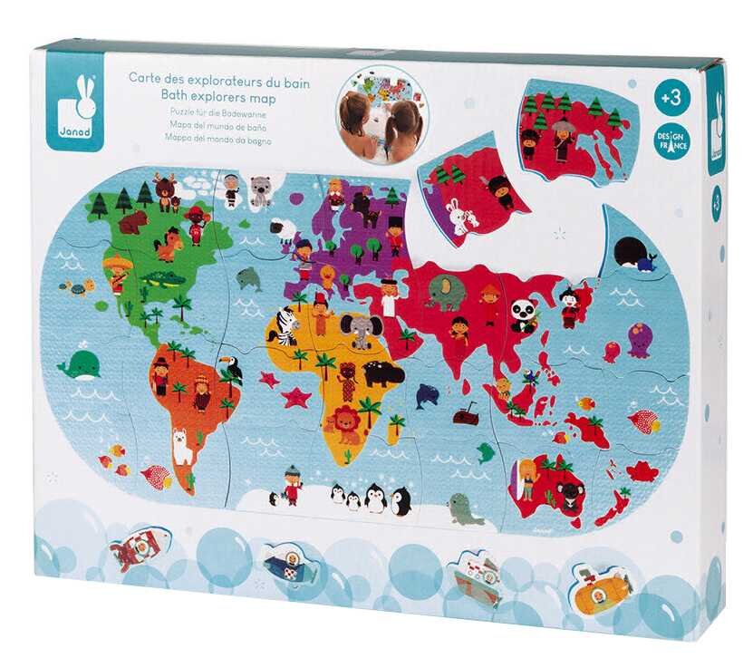 Іграшка для купання пазл Мапа світу від Janod складається з 28 елементів, які можна зібрати у ванні під час купання. Ваша дитина весело подорожуватиме світом завдяки 4 фігуркам транспортних засобів, які пересуваються усім світом у повітрі або під водою… Чари! Після завершення гри пазли можна зберігати в сітці, яка висить на стінах завдяки присоскам.