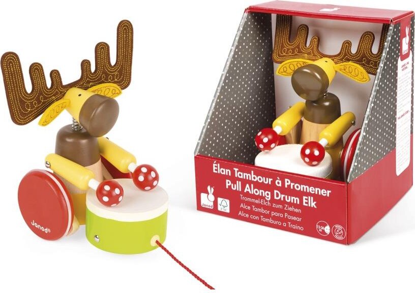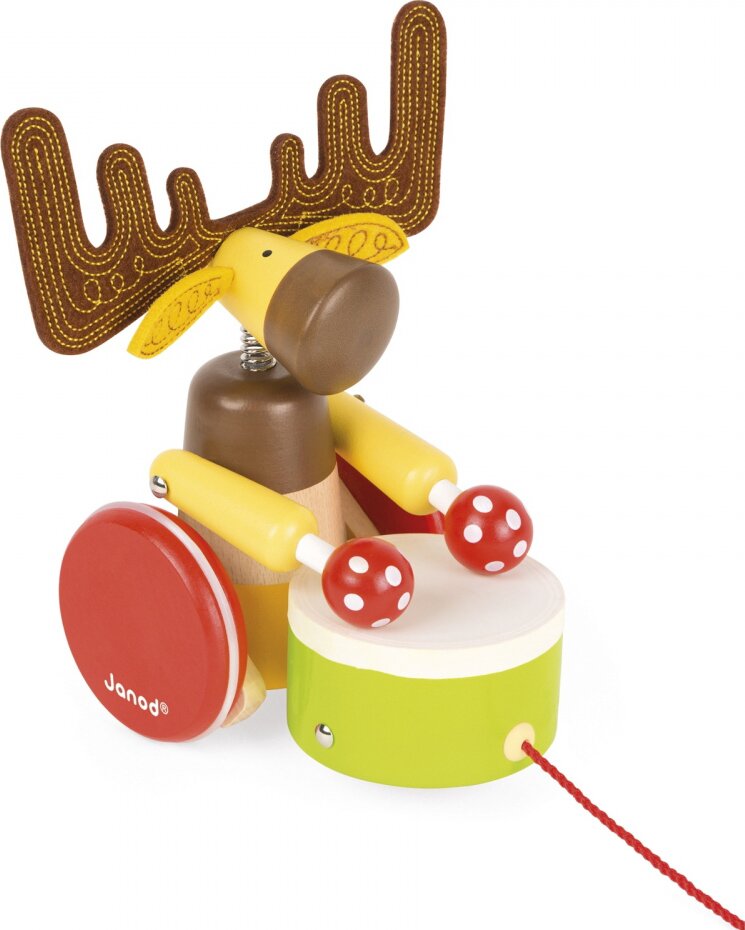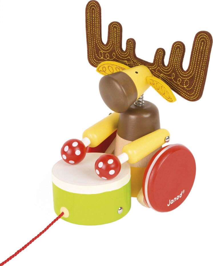 Яскрава каталочка з лосем, що грає на барабані. Чудова іграшка від французького бренда Janod захопить дітей надовго. Коли дитина везе за собою каталочку — лось стукає лапками по барабану, а голова хитається в різні боки.