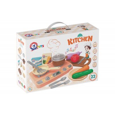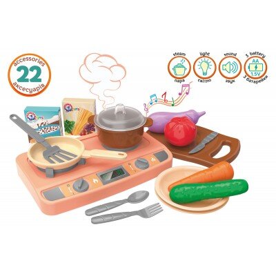 Комплектація: варочна панель з електронним модулем, дощечка, каструля з кришкою, сковорідка, ложка - 2 шт., виделка - 2 шт., ніж - 2 шт., тарілка - 2 шт., виделка велика, шумівка, лопатка, черпак, огірок, морква, баклажан, помідор, коробочка - 2 шт.