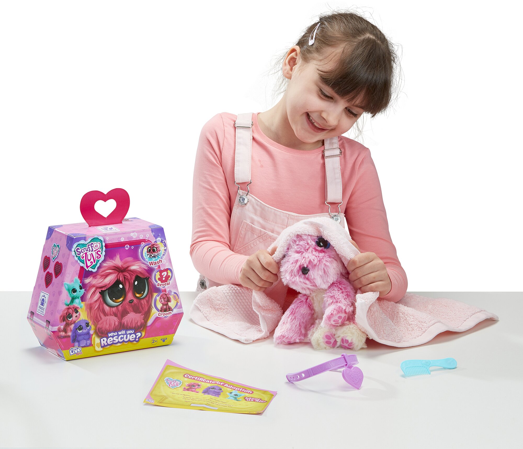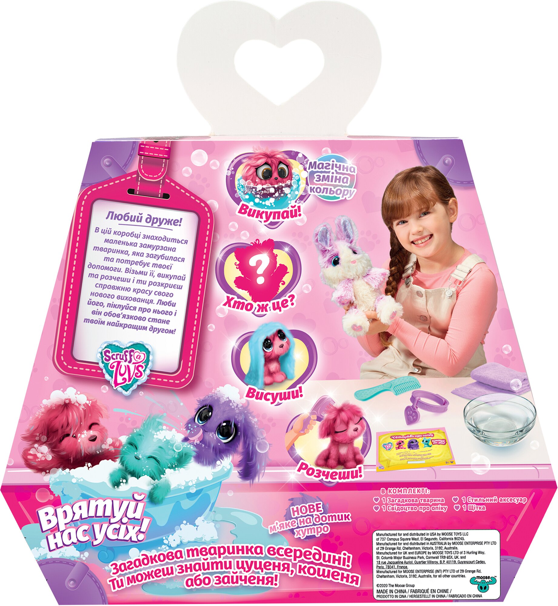 Ви можете натрапити на кошеня, цуценя або кролика. Але ви не впізнаєте його, поки не подбаєте про замурзика. Перетвори замурзика на щасливу тварину за 4 кроки. Усередині коробки таємничий вихованець, який чекає на порятунок! Підготуйте ємність із чистою теплою водою і м'яким шампунем. Помийте його, можливо, кілька разів, щоб відкрити для себе чарівну картину зміни кольору! Слідкуйте за тим, як ваш улюбленець змінює колір, коли ви його миєте. Сполосніть тварину кілька разів у чистій воді. Дізнайтеся, кого ви маєте — собака, кошеня або зайчик. Укутайте свого улюбленця в м'який рушник і добре висушіть його. Можна посушити малюка феном, але покличте дорослих на допомогу. Зробіть йому зачіску. Тепер ваш улюбленець справжній красень! Нова Няшка має довге і суперм'яке хутро, новий дизайн і нові аксесуари.