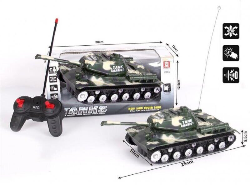 Характеристики: вихідна потужність передавача: 3 мВт, частота роботи: 27.145 МГц, радіус керування: до 10 м, матеріал: пластмаса, розмір танка: 18х10х8 см, живлення танка: 4 батарейки типу АА (не входять до комплекту), живлення пульта керування: 2 батарейки типу АА (не входять до комплекту).