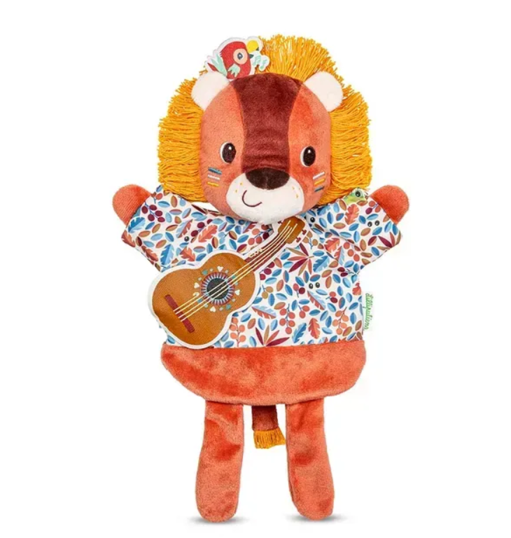 Наш лев-музикант, граючи на гітарі, супроводжує історії та віршики піснею. Він завжди має в голові мелодію і співає своїм друзям з джунглів, коли випадає нагода. Але хто ж ховається в його гриві? Це його друг папуга, який акомпанує йому на бек-вокалі! Просуньте руку крізь плюшеву іграшку і дайте волю своїй уяві. Коли ваша дитина підросте, вона зможе використовувати іграшку для вигадування історій або передачі повідомлень, розвиваючи свою моторику. Цю м'яку ляльку також приємно обіймати, адже вона виготовлена з переробленого поліестеру. Завдяки своїй гарній гриві та мотивам джунглів, наш маленький Джек обов'язково приверне увагу малюків і розсмішить старших!