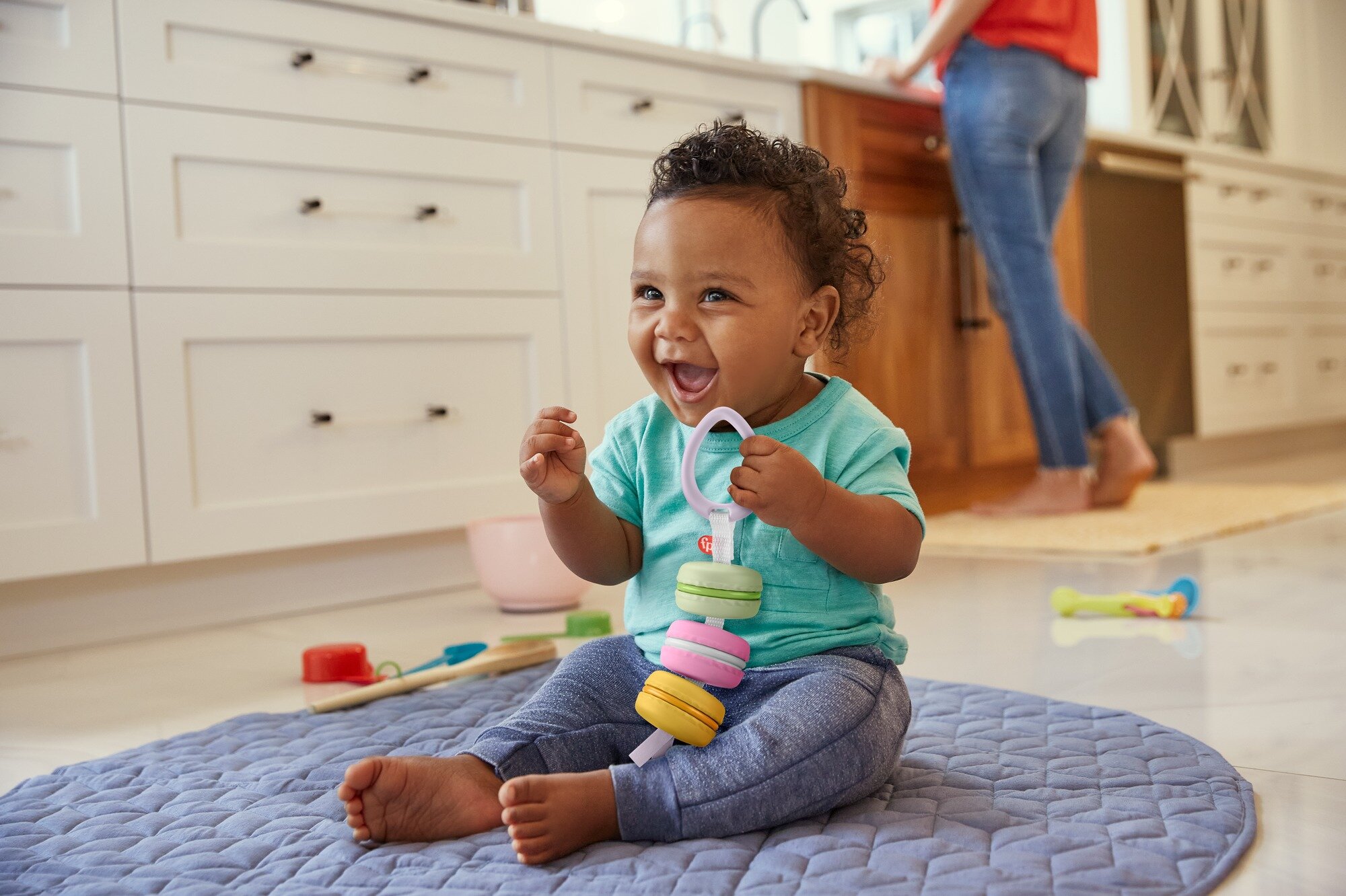 Бонжур, крихітко! З іграшкою-підвіском Мій перший макарун маленькі гурмани можуть клацати та брязкати смаколиками вдома або на прогулянці. Уявіть себе на вулицях Парижа! Ця апетитна іграшка у формі трьох тістечок пастельних кольорів весело дзвенить, якщо її потрясти, і має кільце для зручного кріплення до коляски або сумки.