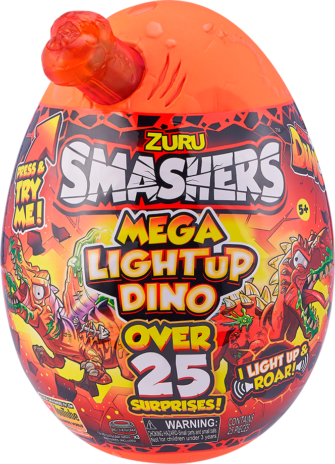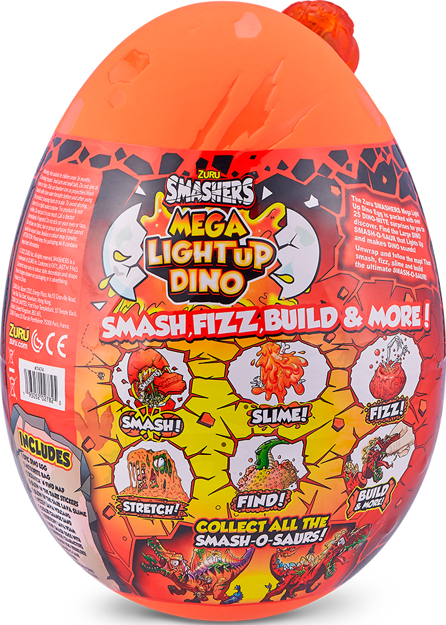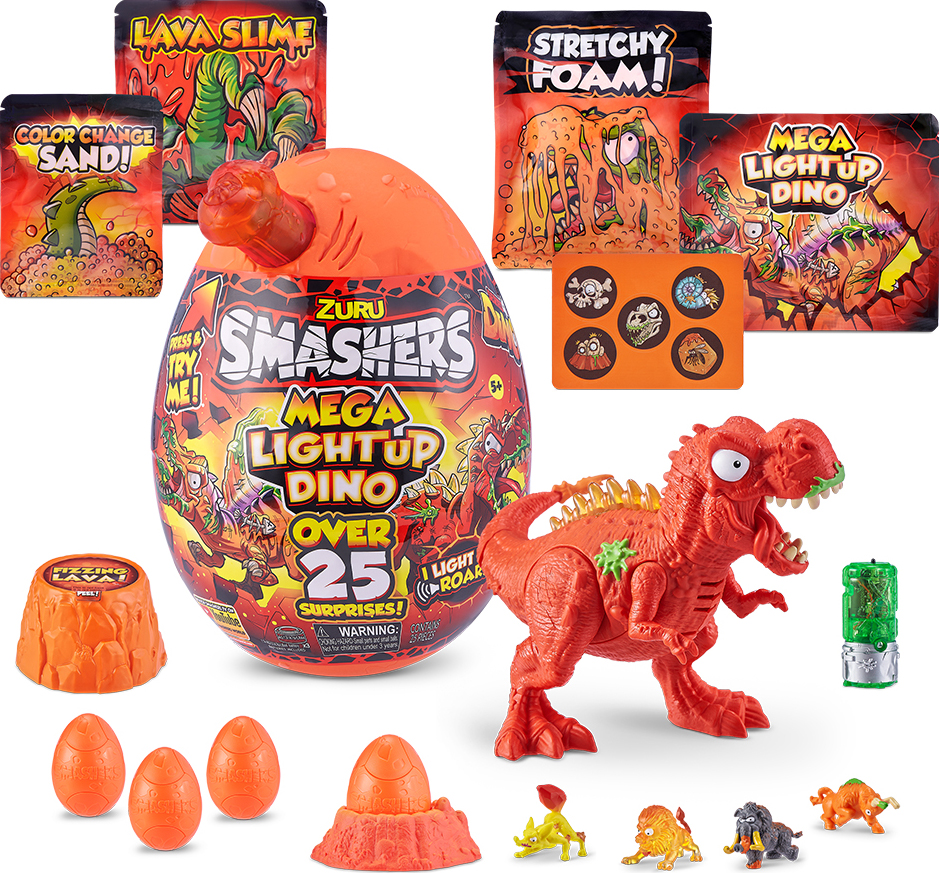 Іграшка в наборі Zuru Smashers із серії Light Up Dino Mega складається з: Великої світної фігурки тварини Звукового світного блока, що розміщений у верхній частині пакування. Елемент живлення LR44 — 3 шт. Мініяйце — 4 шт. Маленька фігурка — 4 шт. Підставка під яйця. Слайм. Кінетичний пісок. Кульковий пластилін. Лава, що збільшується. Наклейки. Скретч-карта. Інструкція.