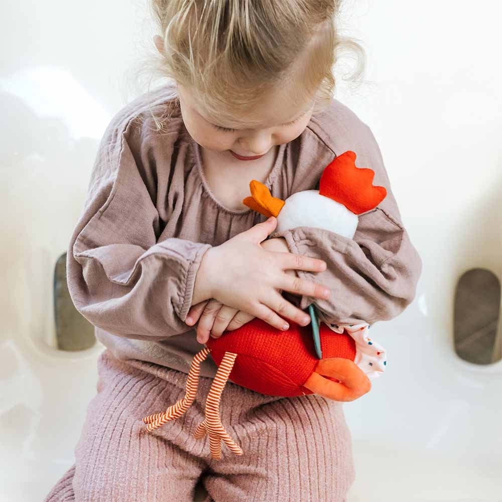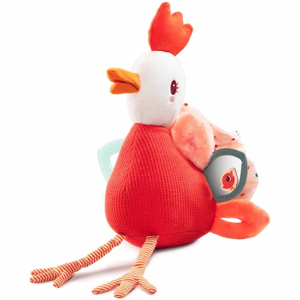 Вона має форму Курочки Полетт із вражаючим червоним гребенем та кольоровим хвостом, який шарудить. У великому червоному животику брязкальце, одне крило у вигляді ручки, яке є текстурованим силіконовим прорізувачем, а інше з гнучким безпечним дзеркалом.
