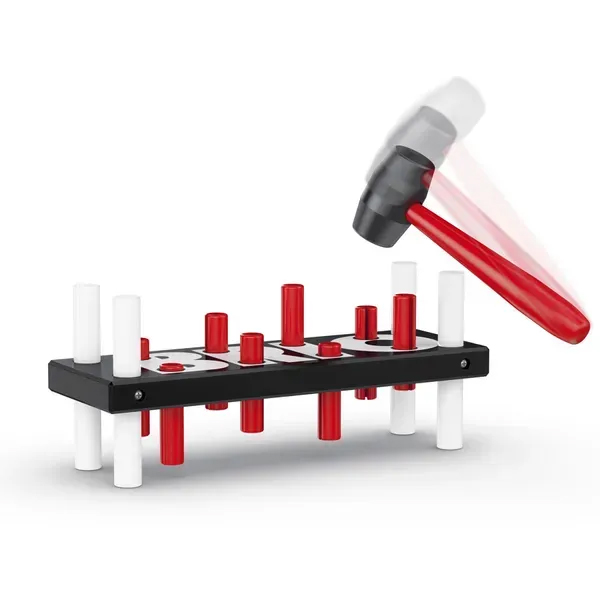 Гра проста й водночас дуже корисна для розвитку дитини. Малюк із задоволенням забиває кілочки молоточком, тренуючи моторику рук, координацію рухів і концентрацію.
