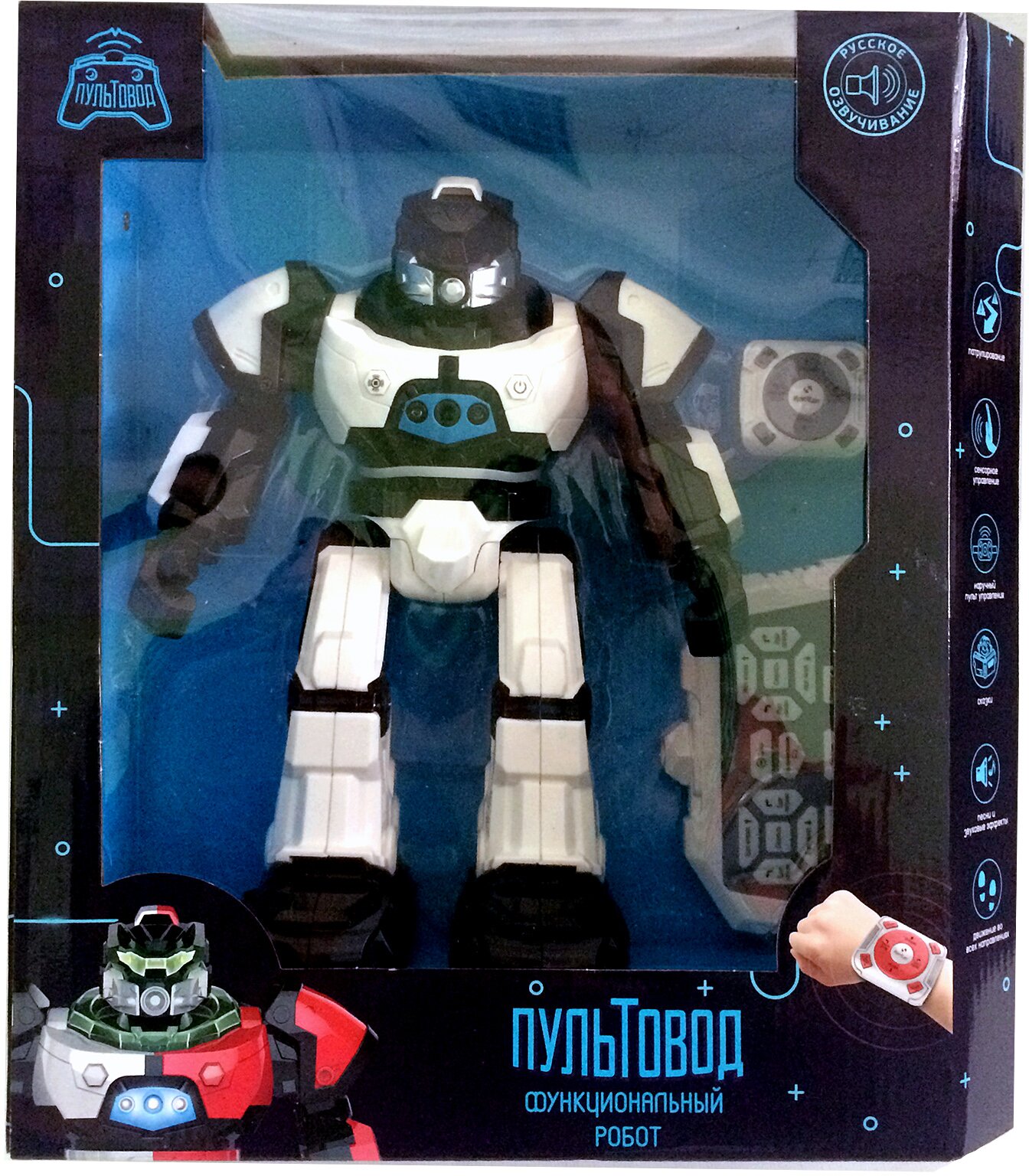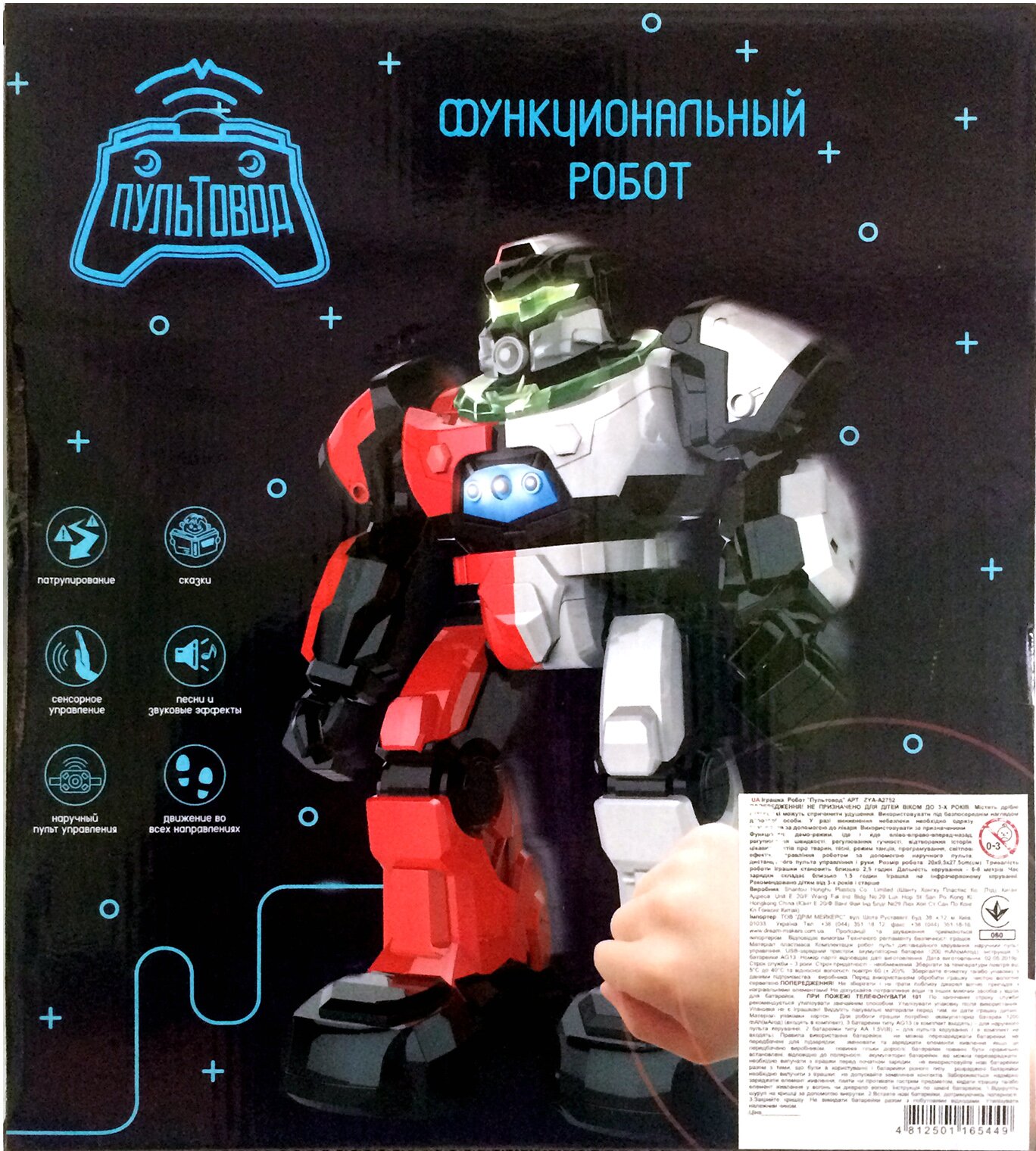 Функціональний робот із серії ПУЛЬТОВОД на інфрачервоному керуванні. Функціонал: Деморежим, їде та йде вліво-вправо-вперед-назад, є регулювання швидкості та регулювання гучності, відтворення історій, цікавих фактів про тварин, музики (3 пісні), режим танців (3 мелодії), програмування, світлові ефекти, керування роботом за допомогою наручного пульта, дистанційного пульта керування й руки, російське озвучення.