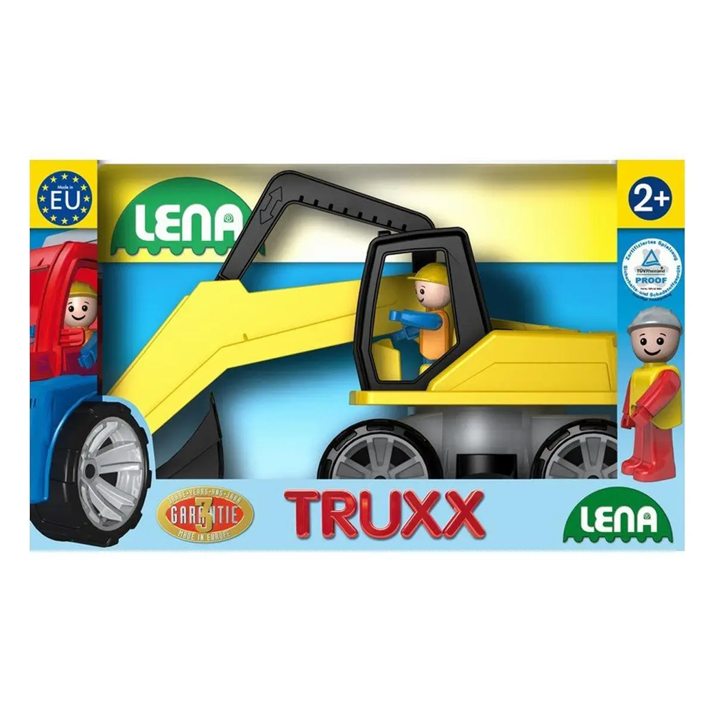 Екскаватор із серії Lena Truxx. Рухомий ківш керується за допомогою ручки. Сталеві осі та відкривна кабіна. У комплекті фігурка робітника.