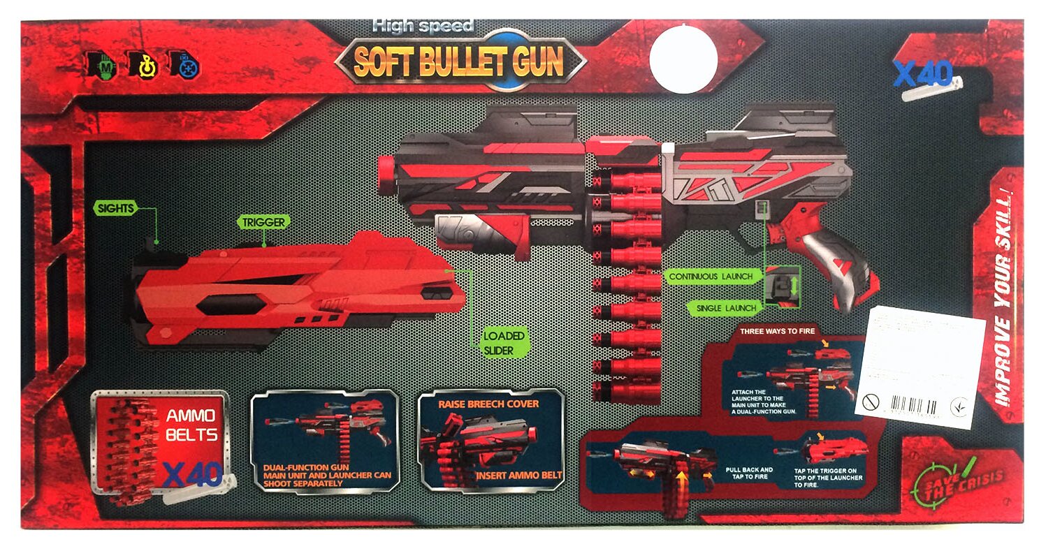 Комплектація: бластер, 40 снарядів, знімний приціл, кулеметна стрічка. Тип: бластер. Тип снарядів: м'які снаряди. Матеріал: пластик. Склад: пластик, метал, ПВХ.