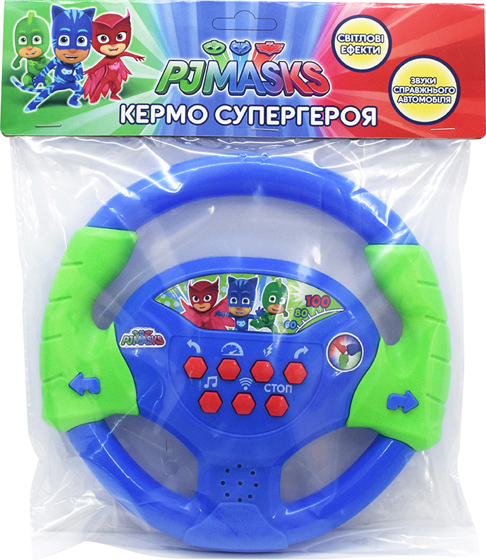 Блакитне кермо діаметром 20 см зроблене з безпечного пластику, декороване наклейкою із зображенням героїв у масах. Іграшка працює від 2 батарейок типу АА (не входять до комплекту).