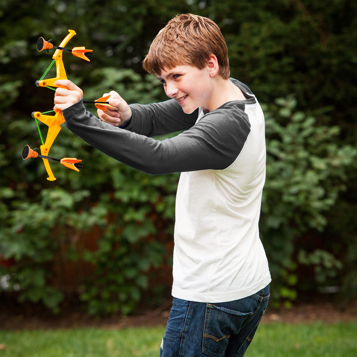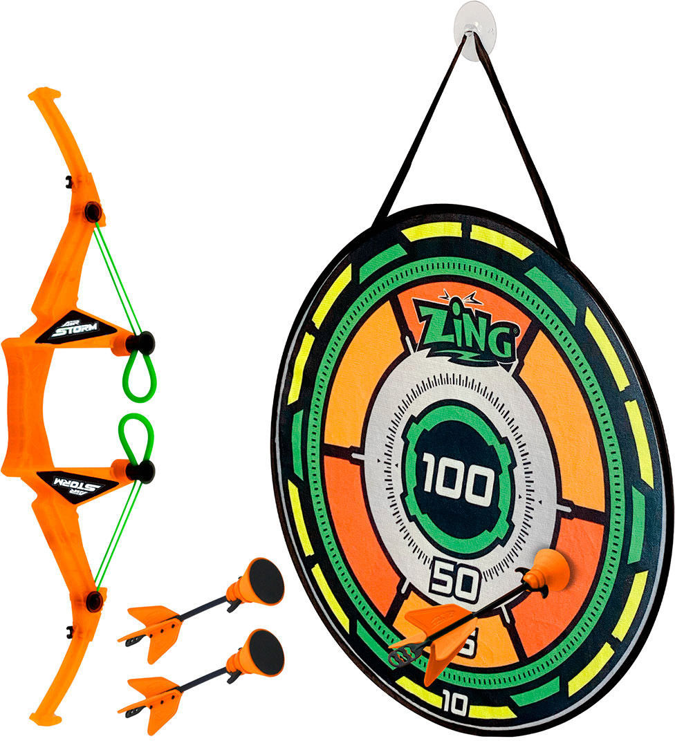 До комплекту входить: лук іграшковий, 3 стріли з м'якими наконечниками-присосками та розкладна мішень 45 см з тканини. Колір: помаранчевий. Обирайте луки одного кольору або різних, в залежності від того, за яку команду будете грати. Помаранчевий - колір команди Соколів, зелений - Вовків.