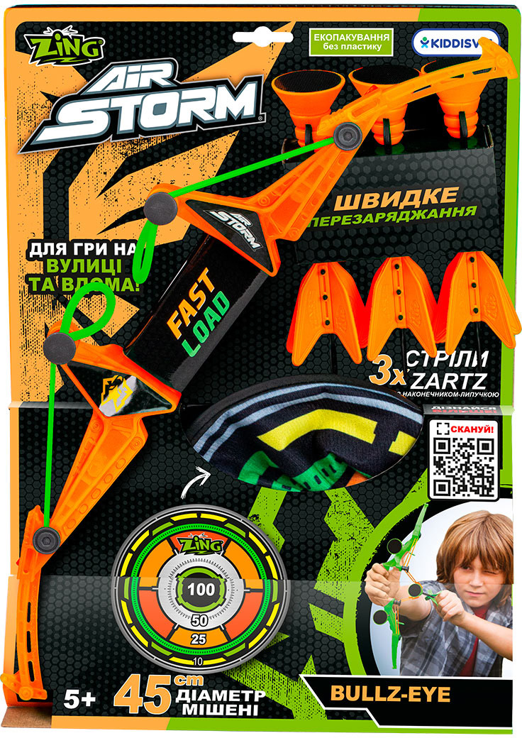 Справжня сила в твоїх руках. Іграшковий лук з мішенню серії Air Storm" - BULLZ EYE - потужний лук з легкою системою запуску стріл. Практикуйтесь, стріляючи в мішень, або влаштовуйте епічні битви з перешкодами! Запатентована технологія запуску. Стріли запускати легко та швидко - просто зачепи стрілу за петлі, натягни та стріляй точно в ціль! Швидке перезарядження гарантує перевагу в битвах! Вдома та на вулиці. Стріли мають м'які наконечники-присоски з піноматеріалу, тому вони повністю безпечні для використання в приміщенні. А потужна сила лука і дальність польоту стріли робить лук BULLZ EYE чудовою розвагою на свіжому повітрі.