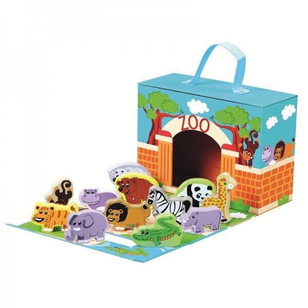 Тварини із зоопарку в дорожній валізці — Коробка використовується для зберігання фігурок і обладнана ручкою для зручного перенесення. Відкрийте і з одного боку використовуйте як ігрову зону. Фігурки виготовлені з високоякісної масивної деревини.