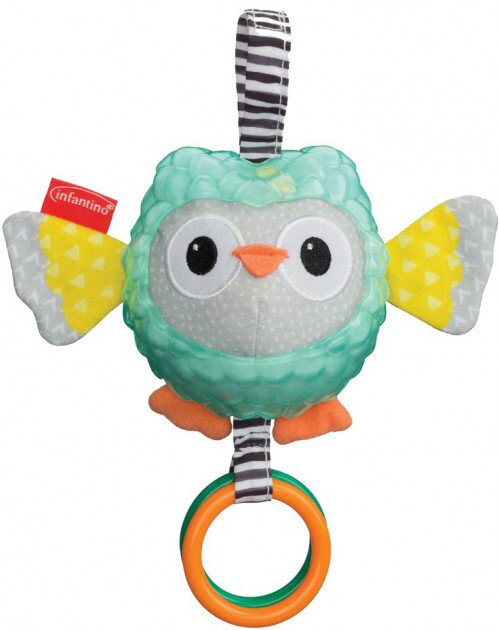 Підвісна м'яка іграшка з вібрацією Infantino Сова — оригінальна підвіска для подорожей. Потягніть за кільця, щоб побачити, як сова махає яскравими крилами. З нею дитина побачить своє відображення в дзеркалі. М'яка текстура підходить для маленьких рук, дитина може легко схопити і потягнути за кільця іграшки.