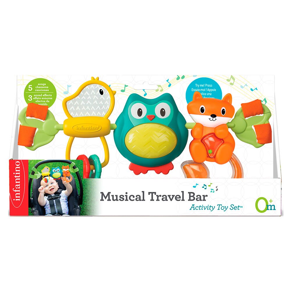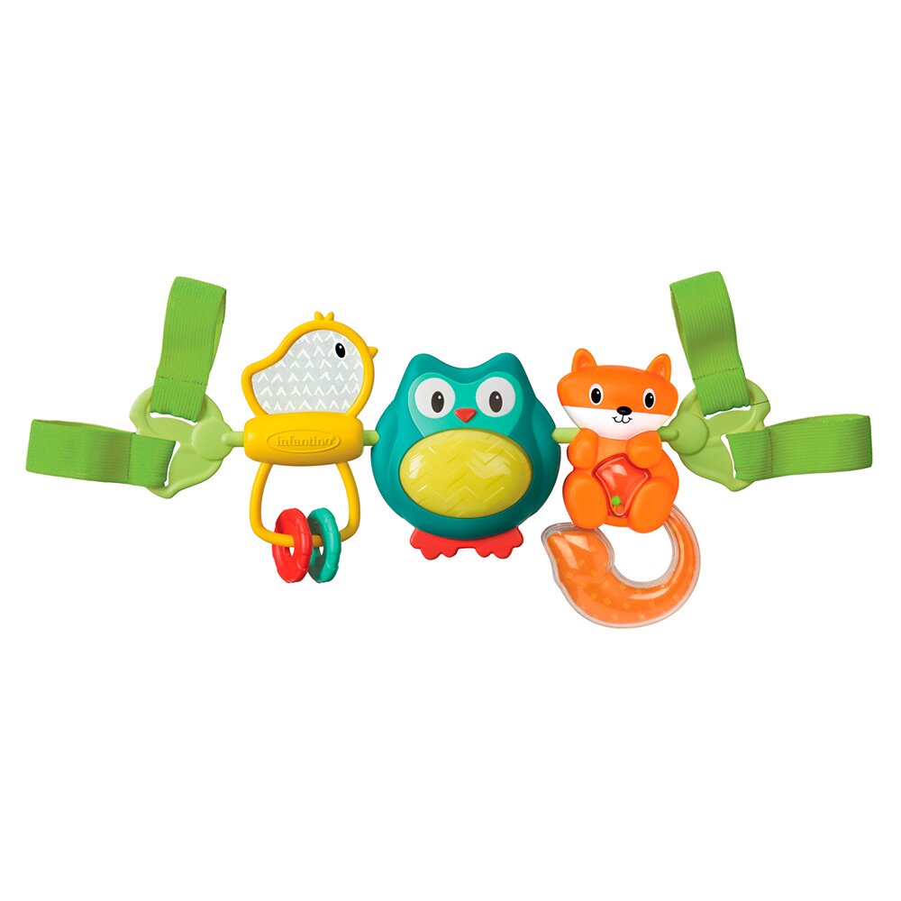 Іграшка-підвіска музична Infantino Мандрівники сподобається дітям. Три яскраві фігурки у вигляді відомих тварин можуть обертатися навколо своєї осі. 4 звукових ефекти та 5 кумедних мелодій, світловий супровід, ковзаючі намистини та фактурна поверхня для розвитку сенсорики та дрібної моторики розважать дитину.