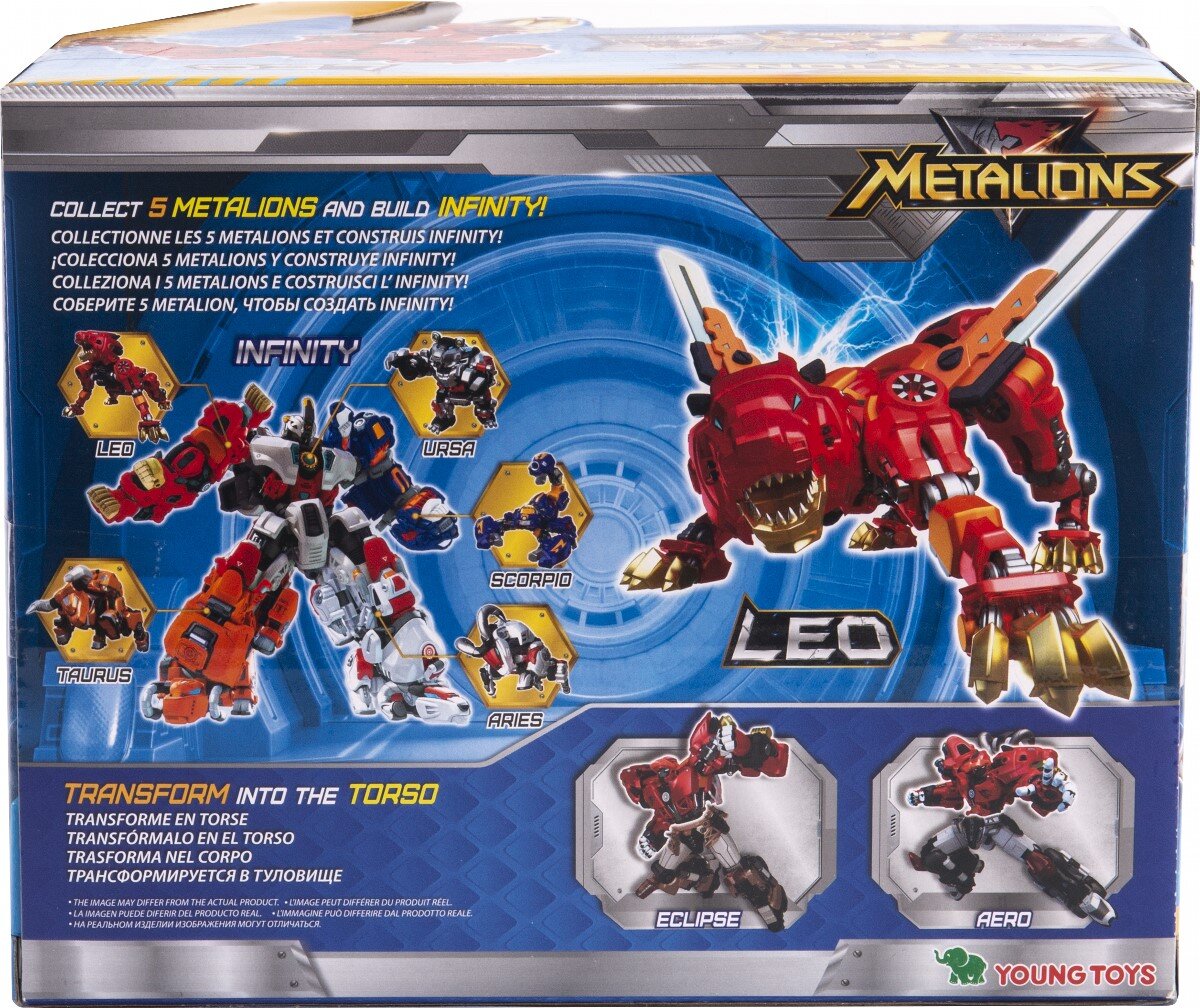 Ігрова фігурка від бренду Metalions Лео - герой популярного мультиплікаційного фільму. У головного героя мультфільму Ілона є фантастичні друзі, які легко трансформуються в тварин, здатних перемогти зло. В команду Ілона входять наступні роботи: Лео - могутній тигр; Таурус - великий бик; Скорпіо - найнебезпечніший скорпіон; Арія - геніальна вівця; Урса - клишоногий ведмідь.