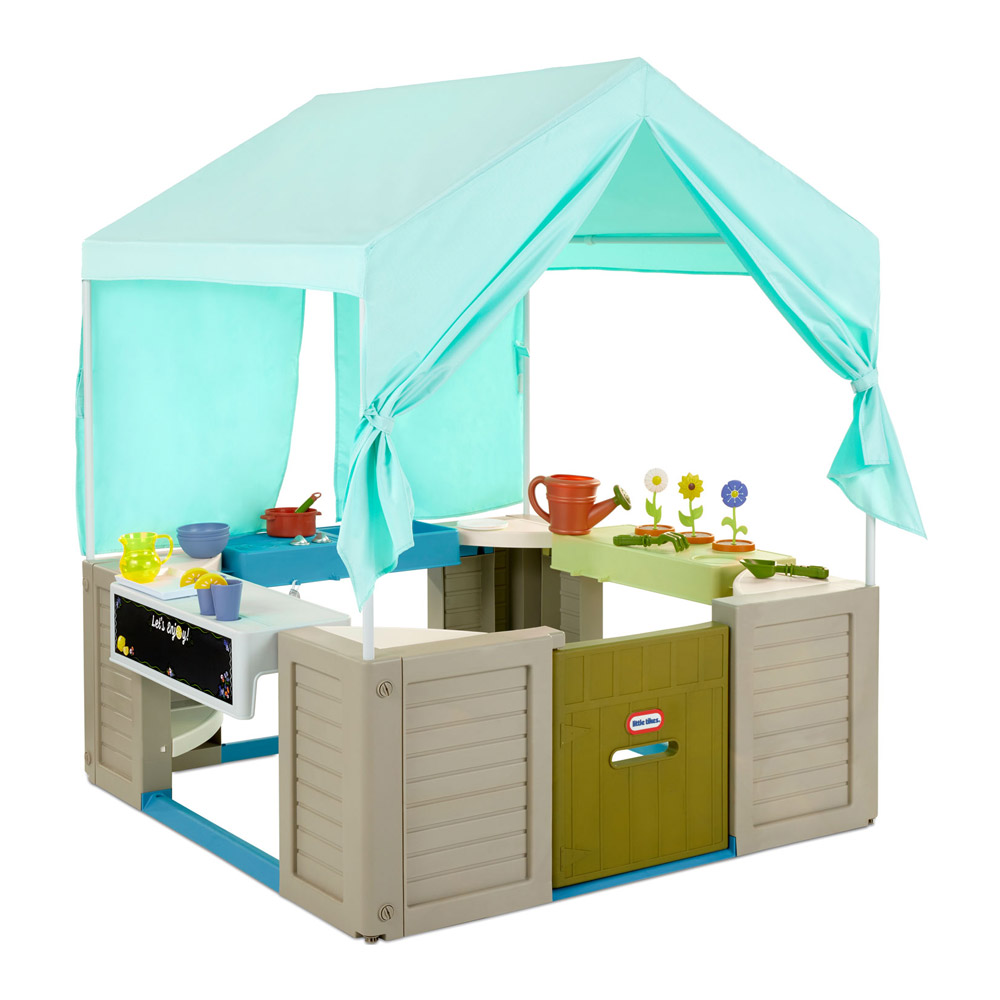 У ньому малюки будуть почувати себе справжніми господарями — зможуть запросити друзів на лимонад і посадити квіти у горщики. Від сонця допоможе захиститися навісний тент м'ятного кольору.