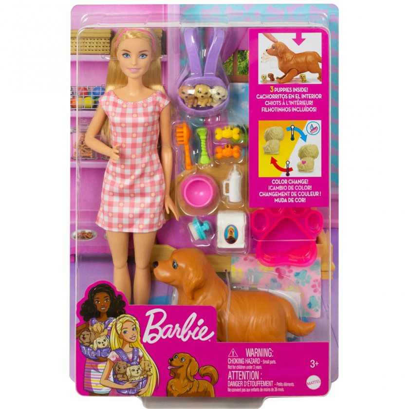 У набір входять: лялька Barbie, одяг і взуття, 1 фігурка собаки, 3 фігурки цуценят, 1 рушник, 2 собачих кістки, 1 іграшка-мотузка, 1 мішок з кормом для собак, 1 щітка, 1 басейн, 1 переноска для цуценят.