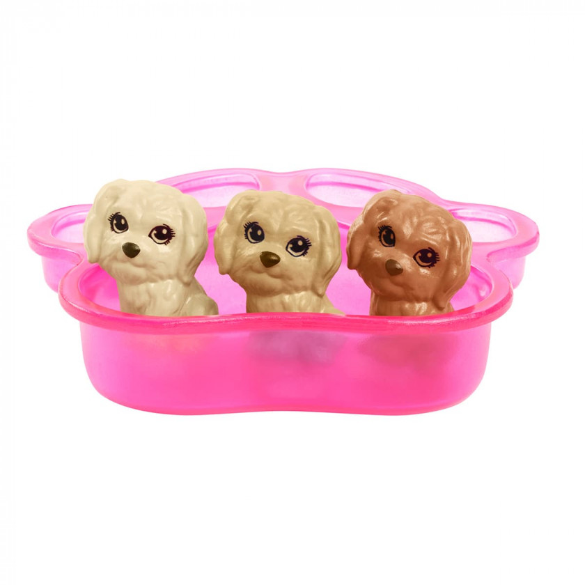 Зустрічайте Ігровий набір Barbie Маленьке тріо! Сюрприз — у чарівної собачки ляльки Barbie скоро з'являться цуценята! Допоможіть народити трьох чарівних цуценят, натиснувши на спину матусі-собачки. Наповніть ванну крижаною водою, потім занурте в неї рушник і проведіть їм по цуценятах, щоб на кожному з них виявилася особлива родима пляма!