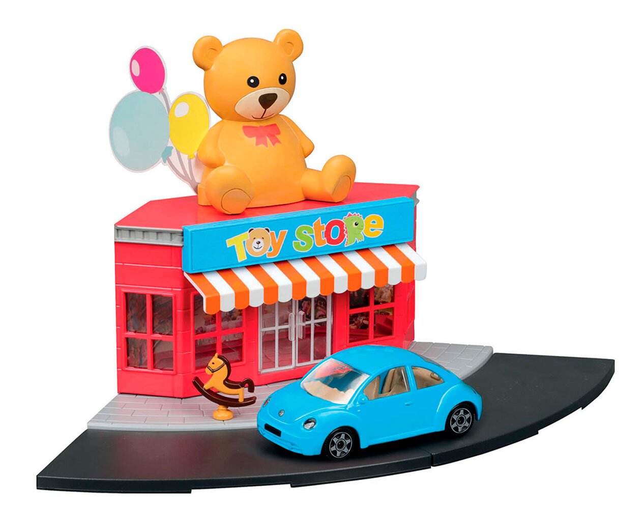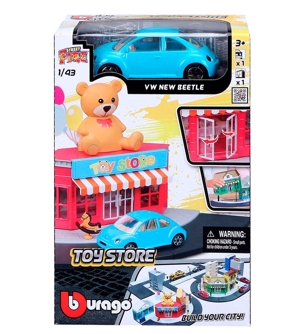 Зустрічайте новинку від бренду Bburago - серію City! Це невеликі тематичні ігрові набори з автомобілями, що поєднуються один з одним та утворюють справжнє маленьке містечко! Ігровий набір серії Bburago City Магазин іграшок включає милий магазинчик з ведмедиком на даху та функціональними дверима і реалістичну металеву модель автомобіля Volkswagen New Beetle в масштабі 1:43. Збирайте своє містечко разом з ігровими наборами Bburago!