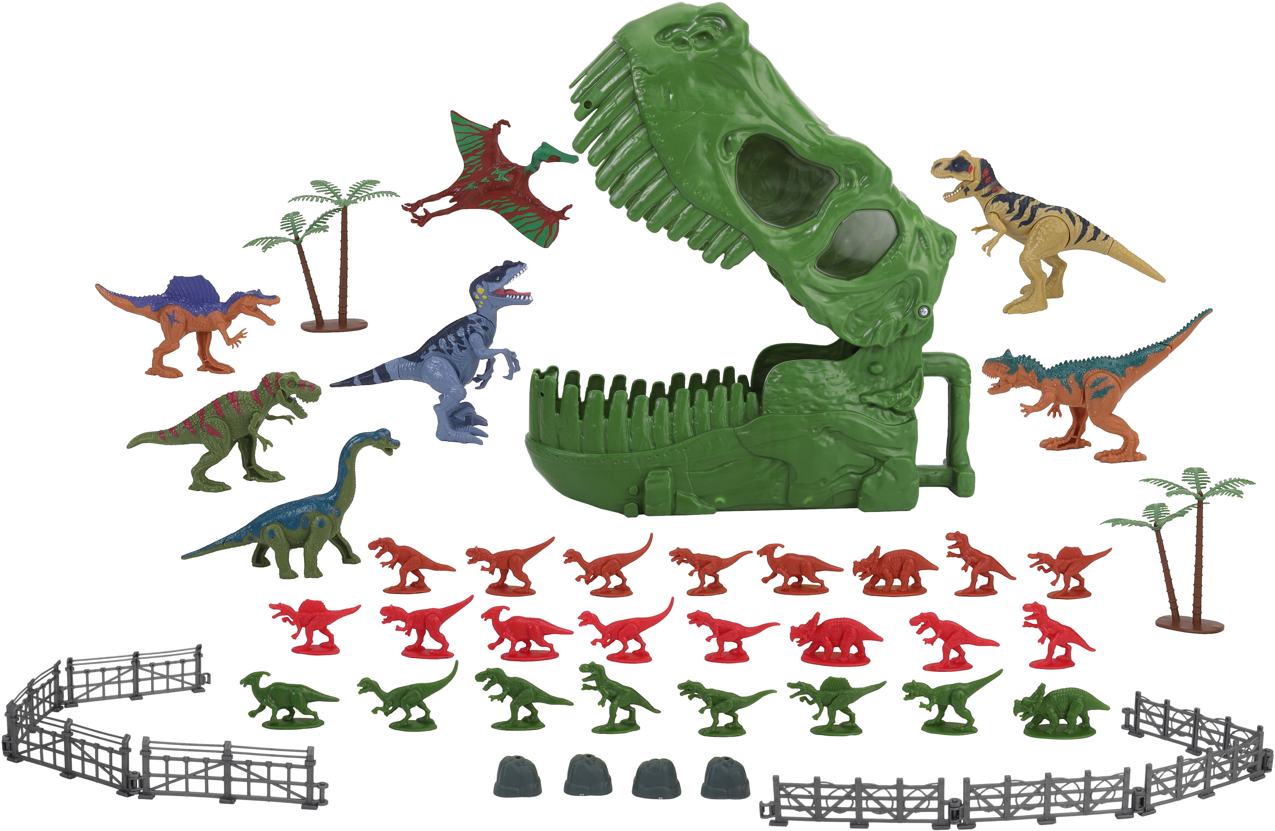Комплектація: чохол у вигляді голови динозавра; 7 динозаврів середнього розміру; 24 фігурки маленького розміру; 6 огороджень; 4 камені; 2 дерева.