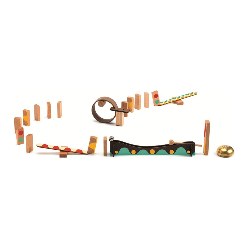 • Ігровий набір Zig and go від французського бренду DJECO на 25 деталей – креативний набір для розвитку дітей. Набір виготовлений з якісних сертифікованих безпечних матеріалів (деревина, метал, пластик). У наборі різні деталі (дерев'яні брусочки, залізна кулька, кругле колесо, дзвіночок) для створення свого покрокового алгоритму. Мета гри: потрапити залізною кулькою в дзвіночок. Малюк буде продумувати різні комбінації, варіанти розстановки фігур на поверхні, розвивати дрібну моторику, просторове мислення з ігровим набором Zig and go.