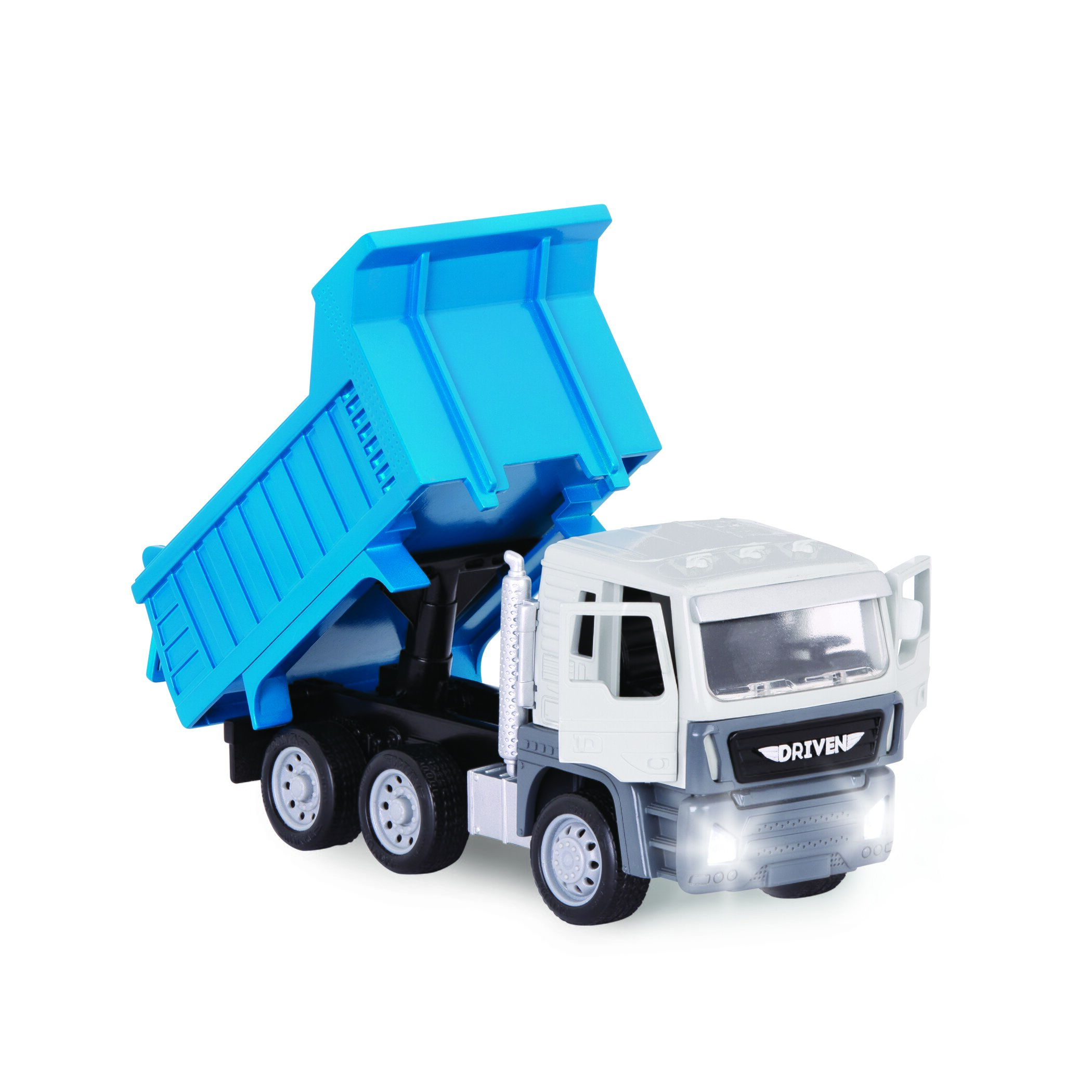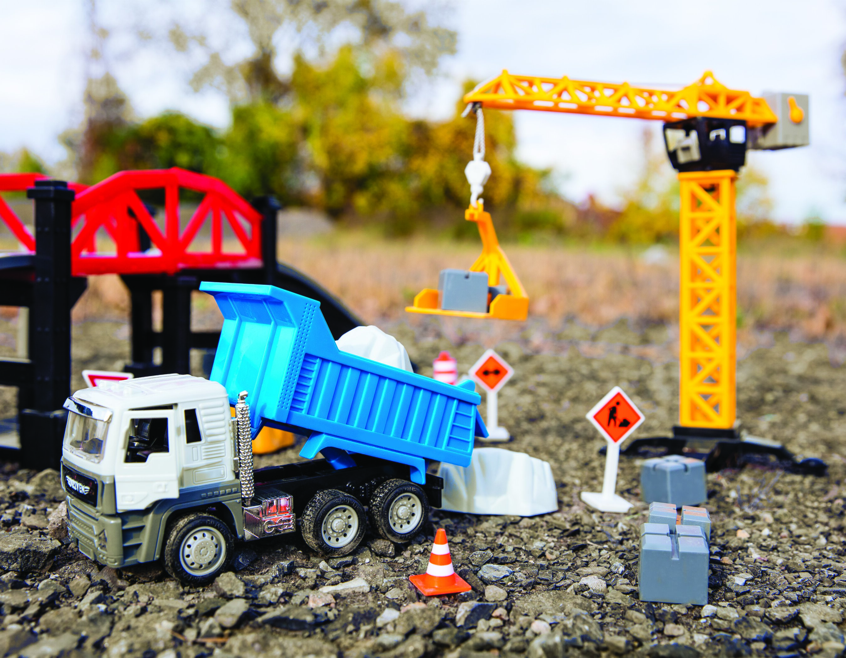 Все деталізовано і функціонально: в самоскида, що працює від батарейок типу AG13 (в комплекті), відчиняються двері, при натисканні на капот вмикаються фари, кузов піднімається, щоб вивантажити будівельні балки; кран обертається і фіксується гаком на місці.