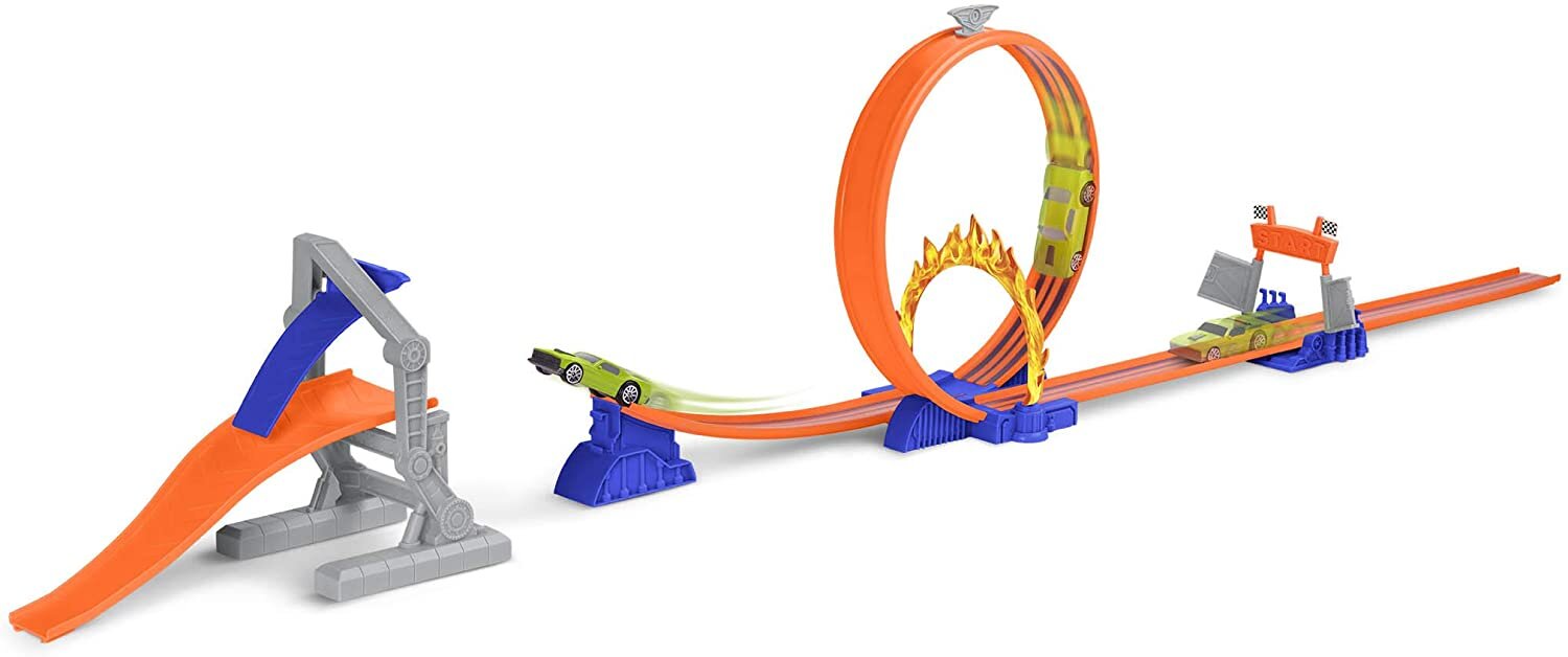 Комплектація 16 деталей, з яких можна скласти крутий трек із стартовими воротами, смертельною петляю на 360° та пандус приземлення. Готові кинути виклик крутій петлі та вогняному кільцю? На старт! Увага! Вперед! Вишикуйте свій автомобіль і дайте йому прорватися через унікальні стартові ворота! Будьте готові пролетіти смертельну петлю та подолати вогняне кільце, злетіти в повітря и приземлитися на пандус. Дитина захоче повторити трюк знову та знову. Можна влаштувати змагання на спритність із друзями.