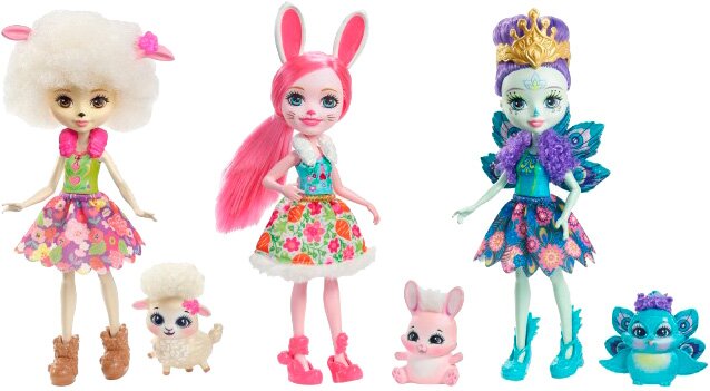 Поринь у світ чудес з цими трьома чудовими ляльками і їх друзями-звірятами. Ляльки Enchantimals — це милі дівчатка, які мають особливий зв'язок зі своїми звірятами: вони не тільки нерозлучні, але навіть схожі! Цей набір з трьох дівчаток Enchantimals містить Кролика Брі і її подругу Твіст, Паву Петтер і її друга Флеп і Ягня Лорна з подружкою Флег. Кожна з цих ляльок висотою 15 см. У них яскраві різнокольорові вбрання і взуття з квітковими візерунками і хутряної окантовкою. Вушка роблять їх дуже схожими на їх друзів-звіряток. Забавні дрібнички — незвичайні волосся, риси обличчя, що нагадують тварин, або ж характерний елемент зовнішності — додають особливий шарм кожному персонажу.