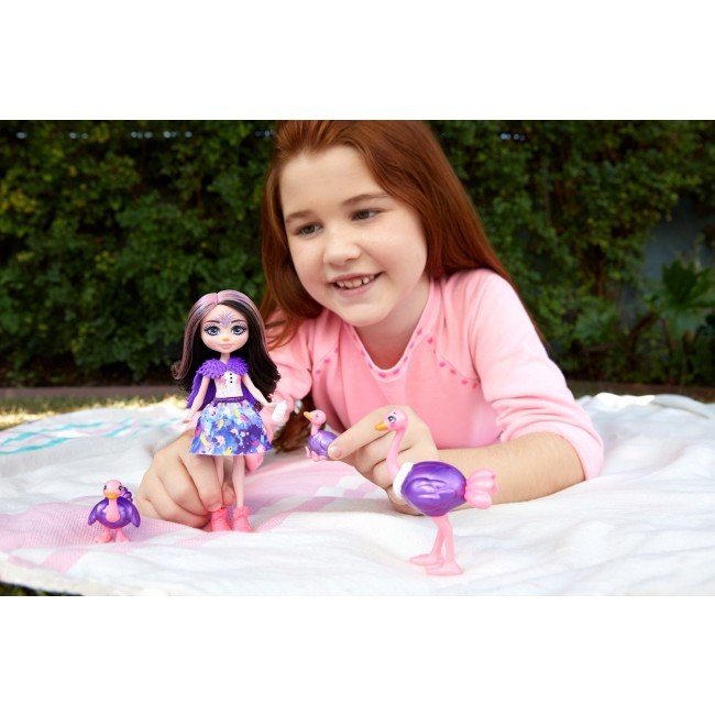 Зустрічайте Enchantimals - компанію чарівних дівчаток, які мають особливий зв’язок зі своїми найкращими друзями-звірятами. Ігровий набір Родина Страуса Офелії з лялькою Страус, 15,2 см заввишки, із серії Сонячна савана Enchantimals та її маленькими друзями - страусятами Рапід, Фезерс та Флаппер, допоможе вам відчути себе частиною веселих пригод посеред савани.
