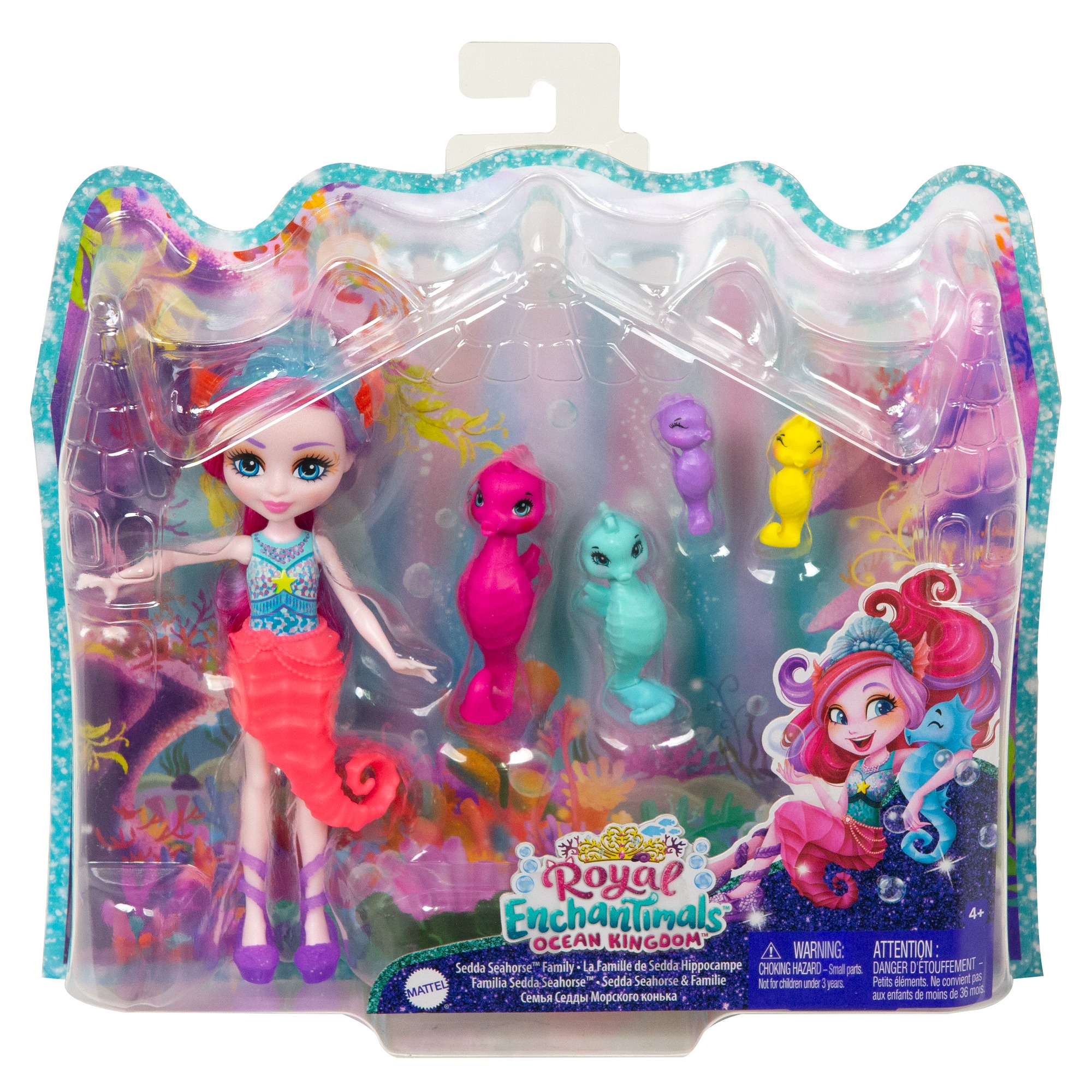 Підніміть справжню хвилю захоплення з ігровим набором Enchantimals Royal Родина Морських коників! До набору входять: лялька Морський коник Седда (15 см); 4 фігурки її друзів-звіряток — зграя маленьких морських коників. Морський коник Седда вдягнена в спідницю у вигляді мушлі, розкішну корону й гарненькі туфельки. Вона та її 4 друзів-морських коників виглядають дуже яскраво завдяки чарівній зовнішності, яку підкреслюють аксесуари, а це ще більше заохочує до творчої гри.