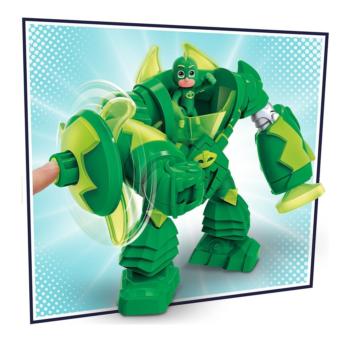 В комплекті повністю артикуляційна фігурка головного персонажа. Руки і ноги фігурки рухаються. Механічний костюм підходить для всіх фігурок PJ MASKS від компанії Hasbro. Спеціальні важелі активують «бойові руки» для швидкої перемоги. Натисніть на амулет, щоб активувати світлові і звукові ефекти. Висота костюма разом з фігуркою 30 див. Костюм оснащений системою Hero ID. Це означає, що при використанні різних фігурок від компанії Hasbro з костюмом Ви почуєте і побачите різні світлові і звукові ефекти. Костюм розрізняє позитивних і негативних героїв. Для роботи потрібні 3 батарейки типу LR44 (входять у набір)