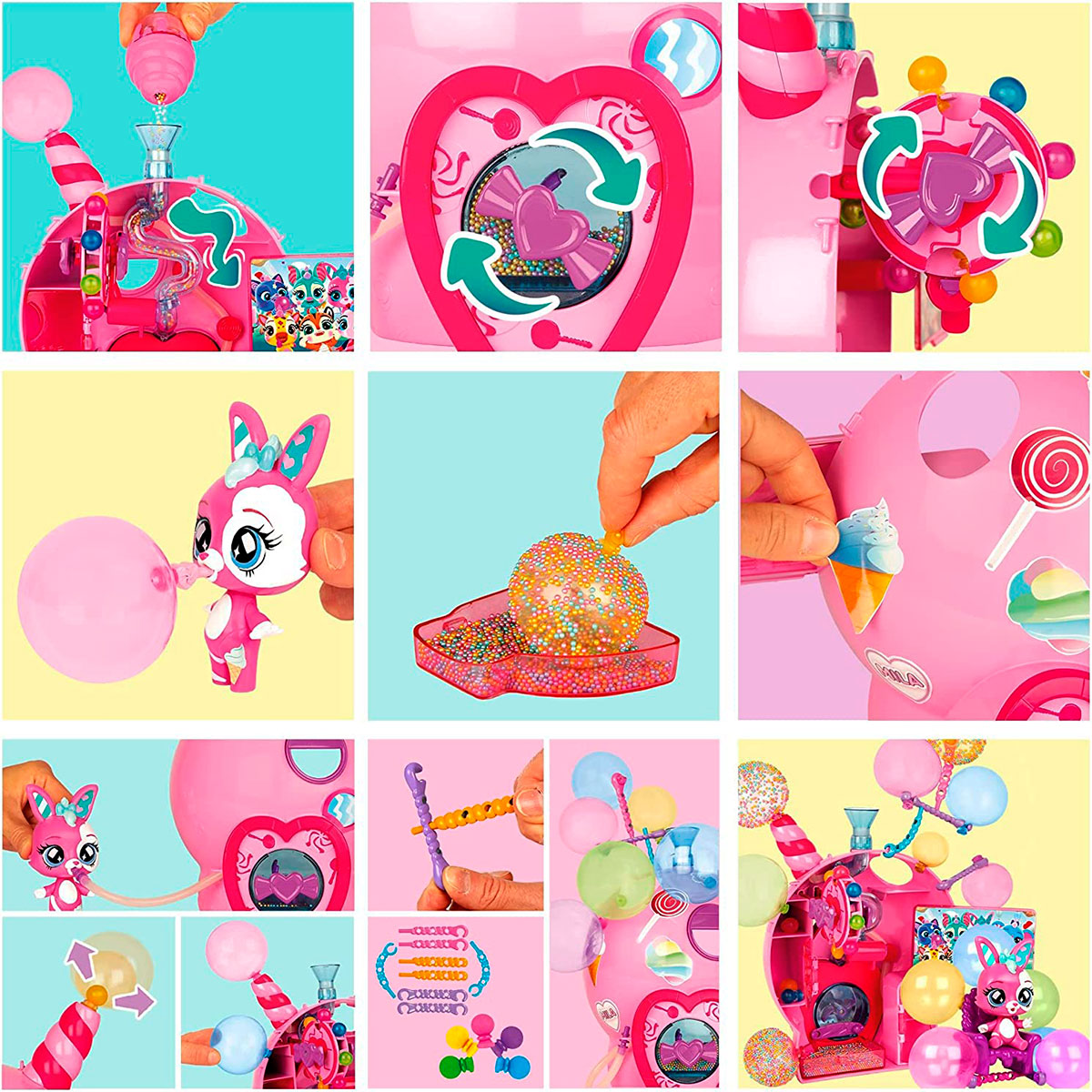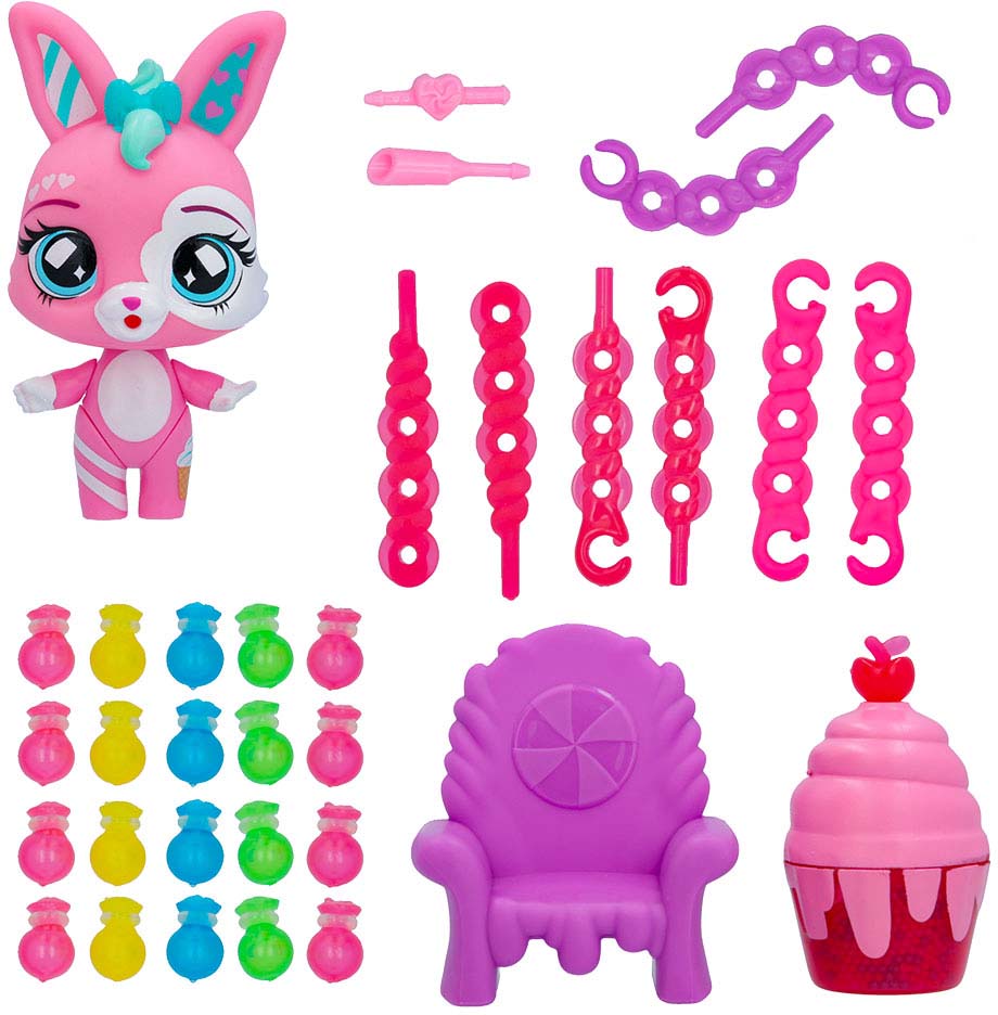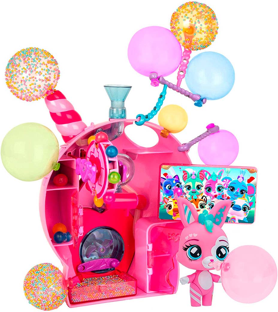 У наборі є колекційний кролик та понад 15 різних аксесуарів: крісло, наклейки, кульки, трубочки для надування. Bubiloons - це справжній сюрприз! Адже у наборі є кульки, які Ваш герой може надувати! Необхідно вставити паличку-трубочку однією стороною до рота героя, а до іншої сторони прикріпити одну з кульок. Здавлюйте голову героя з двох сторін, і дивіться, як надує кулька! Просто неймовірно! Крім того, кульки можна надувати за допомогою лабораторії! Потрібно на даху закріпити кульку, а спеціальну трубочку прикріпити до героя! І можна надувати! Надуті кульки можна прикрашати! Використовуйте для цього маленькі кольорові кульки! І не забудьте прикрасити лабораторію!