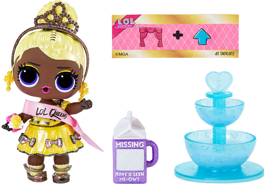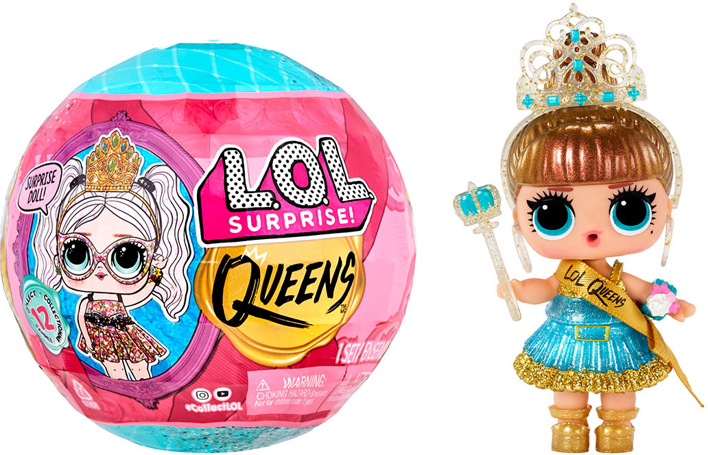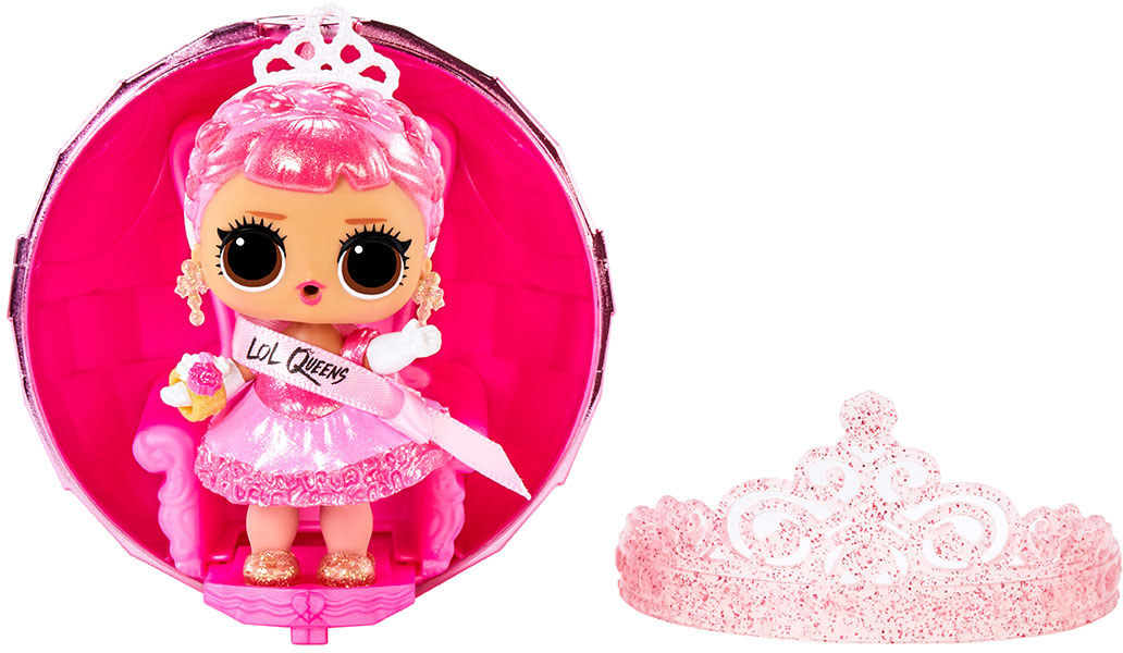 Кулька L.O.L. серії Queens просто неймовірний, адже всередині ви знайдете блискучу лялечку з короною, королівським аксесуаром та стрічкою, а кулька перетворюється на справжній трон.