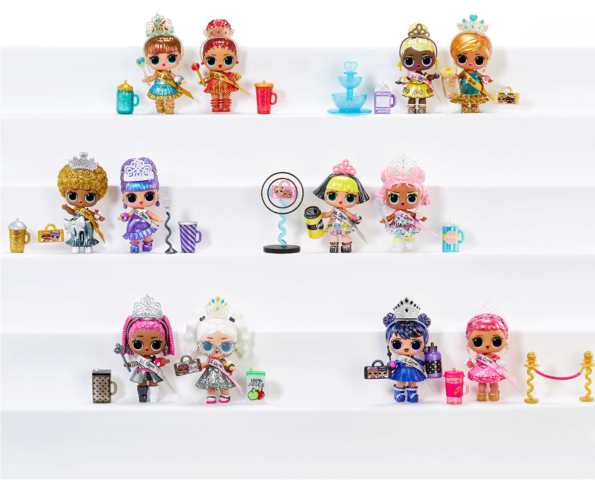 У кульки L.O.L. 9 сюрпризів: лялька в святковому мерехтливому образі, наклейка з секретним повідомленням, блискуча пляшечка, черевики, королівський наряд з блискітками, корона, аксесуар, стрічка, кулька, що перетворюється на шикарний трон.