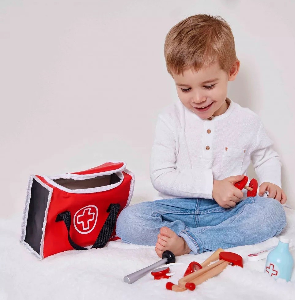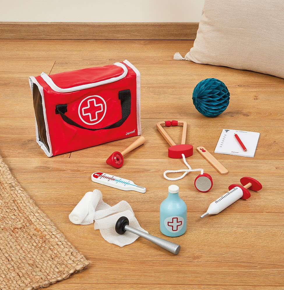 Великий і такий цікавий набір для гри у доктора від французького бренду Janod. Чемоданчик із набору наче справжній, тут зберігаються 10 аксесуарів: шприц, рефлекторний молоток, пляшечка із дезінфікуючим засобом, стетоскоп, отоскоп із збільшуваним склом, термометр, язикотримач, блокнот з рецептами, олівець та бинт. Усі елементи вироблені із натурального дерева та пластику, матеріал нетоксичний та абсолютно безпечний для дітей. Набір розвиватиме креативність, уяву, навчить піклуватись за людьми і, можливо, прищепить любов до медицини. Рекомендовано для дітей віком від 3-х років.