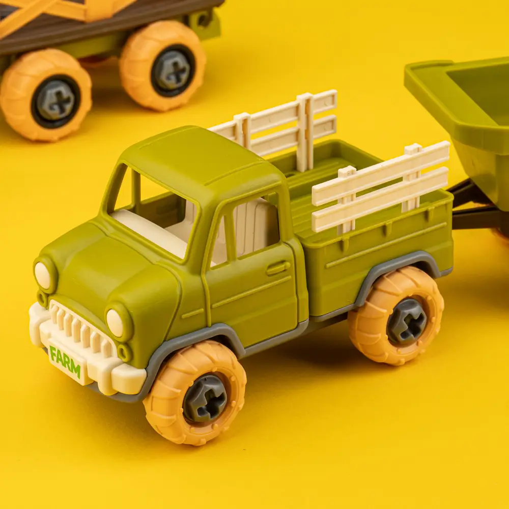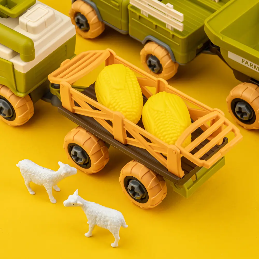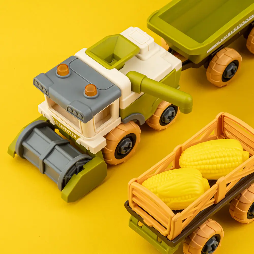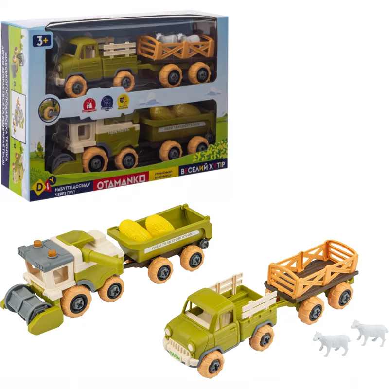 В комплекті: комбайн з причепом, вантажівка з причепом, фігурки овець, викрутка для збирання\розбирання.