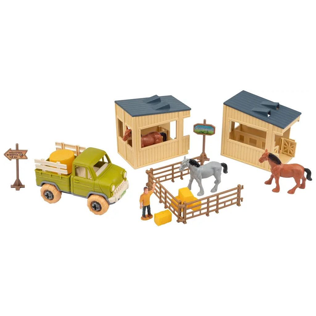 В комплекті: вантажівка, стайня, фігурки фермера, тваринок та додаткові аксесуари, викрутка для збирання\розбирання.