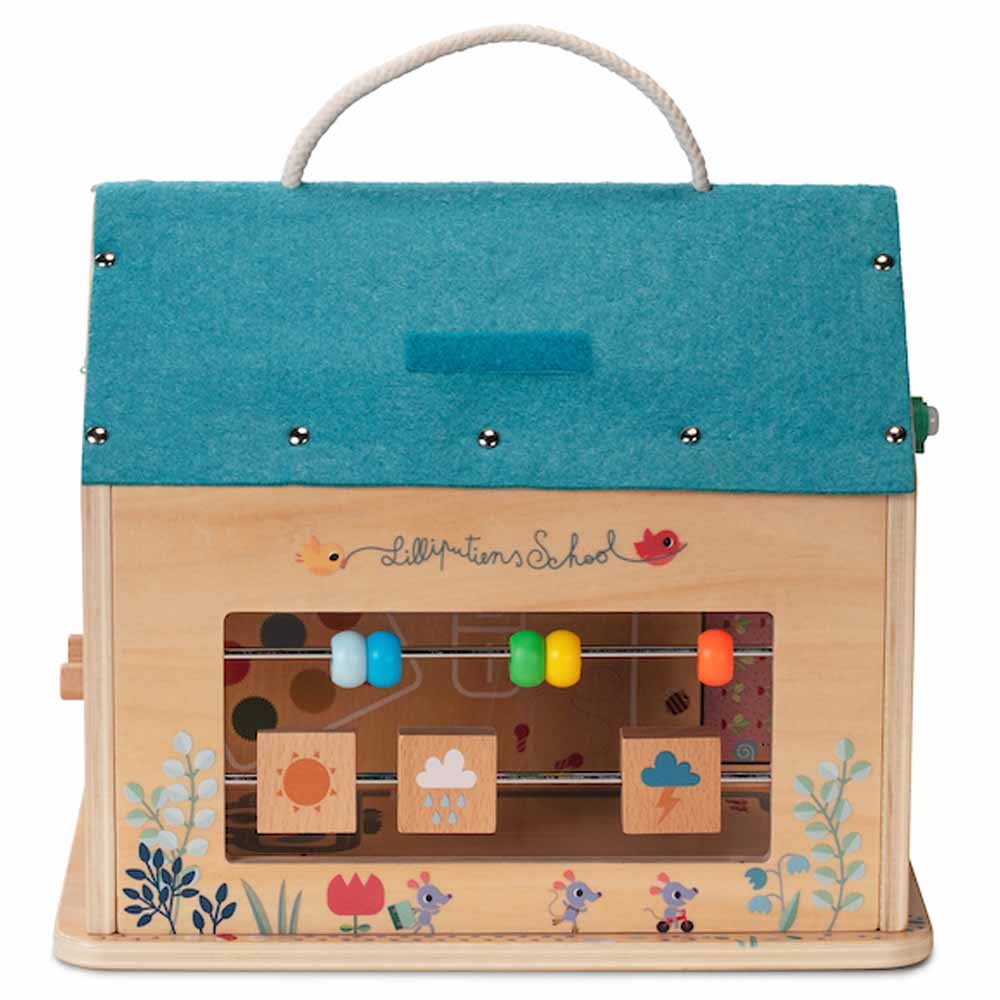 Ігровий набір Lilliputiens Моя перша Школа (83422), в якому Стелла та Джо йдуть до школи з шкільним портфелем за спиною. Міс Аліса, вчителька, готує свій клас до приємного навчального дня зі своїми учнями.