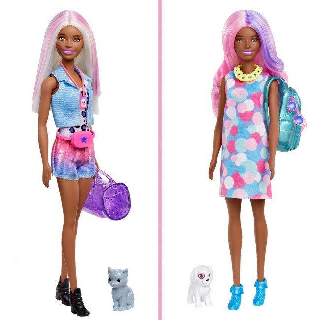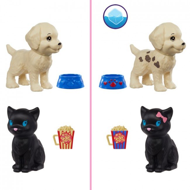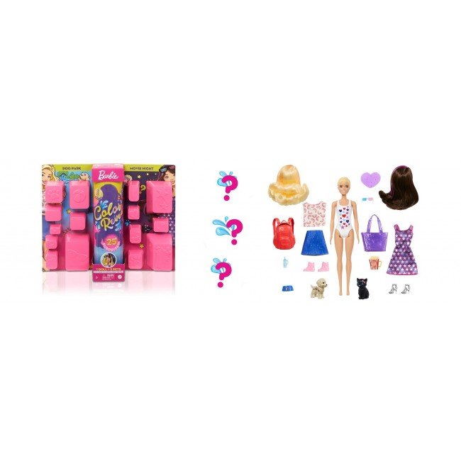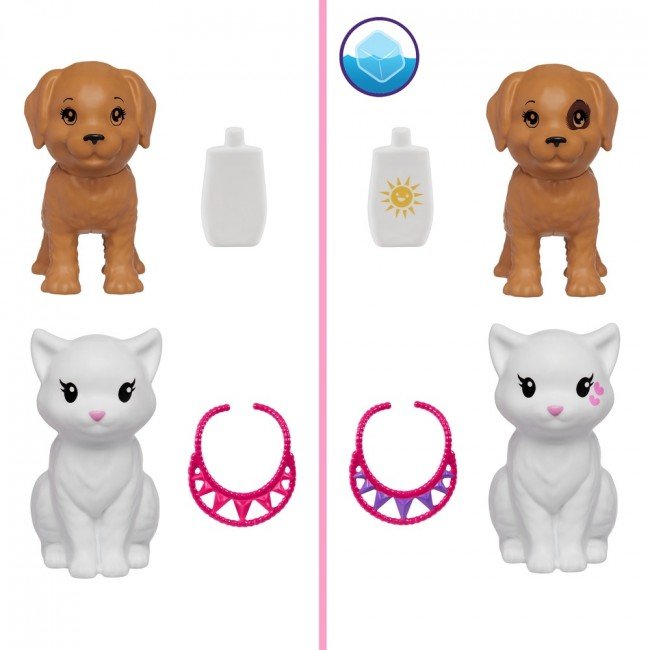 Кожна лялька має різну комбінацію кольору очей, волосся, тону шкіри та купальника. Розкрийте всі 15 пакетиків, щоб знайти одяг та аксесуари для двох завершених образів, включаючи 2 перуки, що змінюють колір, маленьку губку та 2 улюбленців серії Color Reveal! Сюрпризи продовжуються... занурте улюбленців у воду, щоб розкрити їх образи! Використовуйте аксесуари, щоб одягти ляльку та розіграти історії, а потім змініть її! Занурте губку в холодну воду і використовуйте її для зміни зачісок та обличчя ляльки, а також для зміни 2 улюбленців та їх аксесуарів! Використовуючи теплу і крижану воду, діти можуть повторювати ці дивовижні моменти знову і знову! В набір входить лялька, 2 тваринки, 2 наряди, 2 сумки, 2 перуки, що змінюють колір, 2 аксесуари, що змінюють колір, губка та інші тематичні аксесуари. Кожен набір продається окремо, залежно від наявності. Лялька не може стояти самостійно. Кольори та аксесуари можуть відрізнятися.