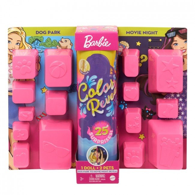 Відкрийте 15 пакетиків з сюрпризами через задню панель та дізнайтесь, що всередині; потім витягніть центральну трубку та потягніть за стрічку, щоб зняти зовнішній шар. Всередині ви знайдете містичну ляльку Barbie Кольорове перевтілення день/ніч з золотим покриттям. Наповніть трубку теплою водою, помістіть туди ляльку та покрутіть її. Вода змінить колір на золотий, і коли ви витягнете ляльку, розкриються її особливості!