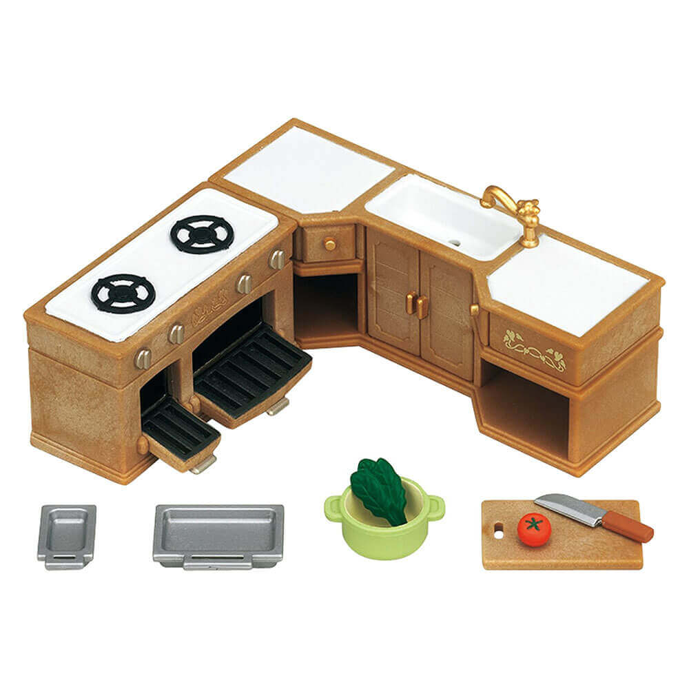 Меблі для кухні Сільваніан Фемеліс містять плиту з духовкою, тумбочки з шафами, кухонне приладдя та продукти. Барвистий набір допоможе розіграти повсякденні сцени приготування їжі та годування всіх членів великої родини. Зверніть увагу, фігурки до комплекту не входять.