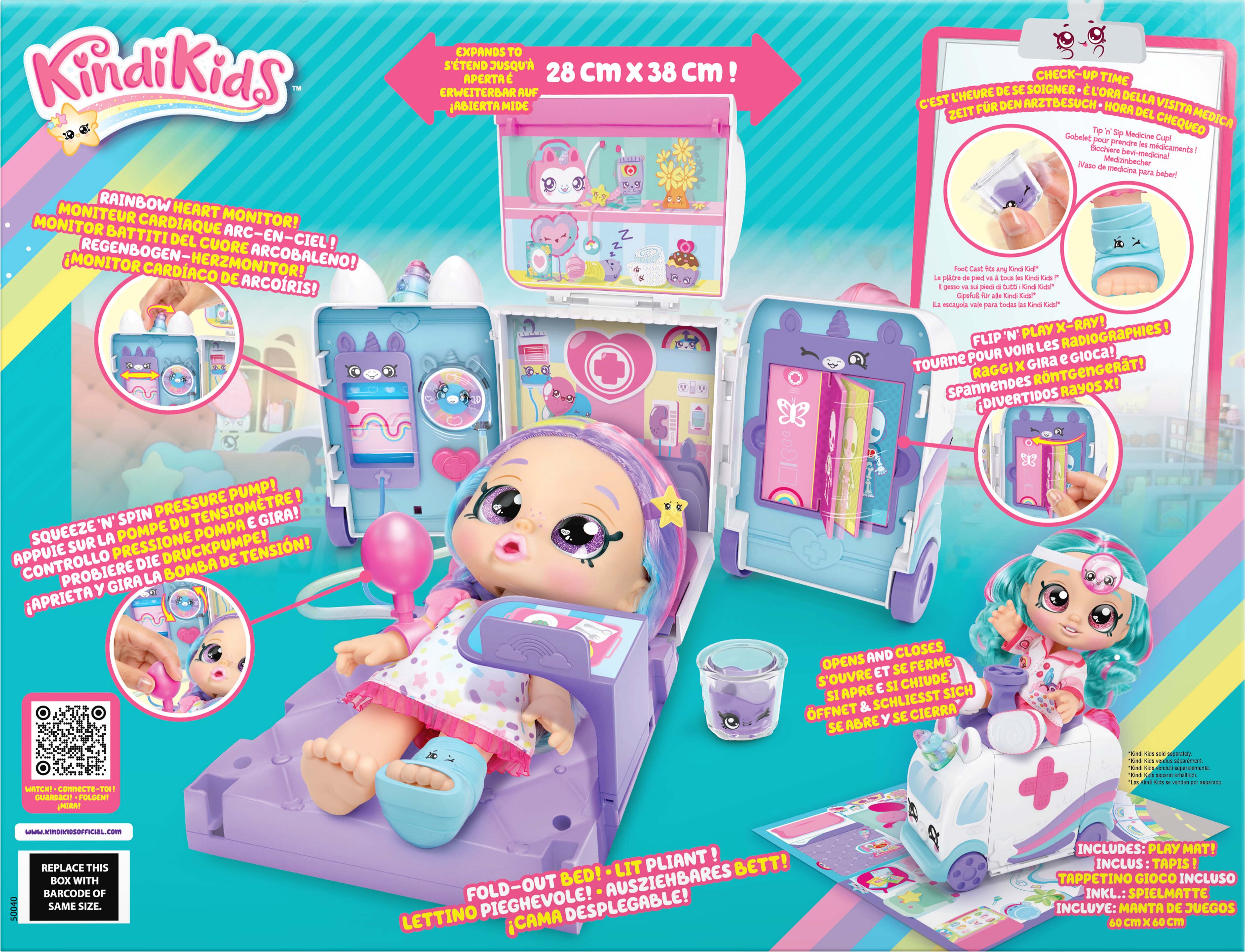 Швидка допомога Moose Kindi Fun на шляху! Посадіть ляльку зверху та спостерігайте, як ріг єдинорога крутиться, коли Кінді їдуть на допомогу. Потім відкрийте швидку допомогу, щоб побачити, як вона розширюється до величезної лікарняної кімнати з великою кількістю дивовижних інтерактивних пристроїв, щоб допомогти зцілити ваших ляльок Kindi Kids!Розкладене ліжко ідеального розміру, щоб покласти ляльку. Закріпіть насос тиску на руку ляльки та стисніть його, щоб побачити, як монітор крутиться! Перевірте серце Kindi за допомогою монітора Rainbow Heart. Використовуйте дивовижний рентген-апарат, щоб перевірити наявність зламаних кісток.
